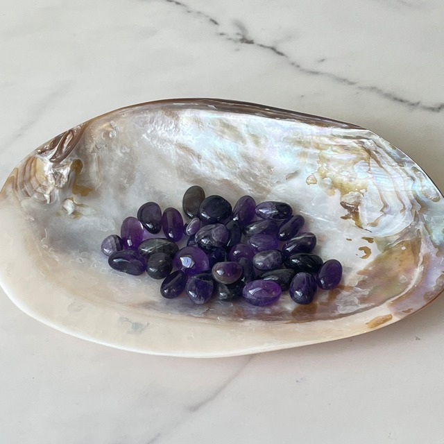 【アメジストさざれ 50g】 ~深い癒しと高貴なエネルギーを宿す、濃紫のさざれ石~ 深みのある紫が美しい、アメジストのさざれ石。 大きめの粒感で、小豆や大豆ほどのサイズ感が中心。コロンとした丸みのある形状が多く、見た目にも愛らしく存在感があります。 お皿やプレートに敷いて、お気に入りの天然石やアクセサリーの浄化に。 また、空間の浄化やお守りとして飾っておくのもおすすめです。 濃い色味と程よいボリューム感があり、ひとつ持っておくと重宝するアイテムです。 ― アメジストの意味・効果 ― ・心を穏やかにし、深い癒しを与える ・精神的な安定や直感力の向上 ・安眠やストレス緩和のサポート ・持ち主を守る強力なお守り石としても人気 ― 内容量 ― 約50g(※天然石のため、形や色味には個体差があります) ※天然石は自然が作り出した鉱物であるため、微細の傷、内包物、クラックなどが見られることがあります。結晶ができあがる過程で自然に生じた美しい天然石の証であり、魅力でもあります。ぜひお楽しみください。 ※ご利用のモニターやブラウザ又は、撮影環境によっては色や印象が若干異なることもございますので予めご了承ください。 ※一点もののため、返品交換はできません。