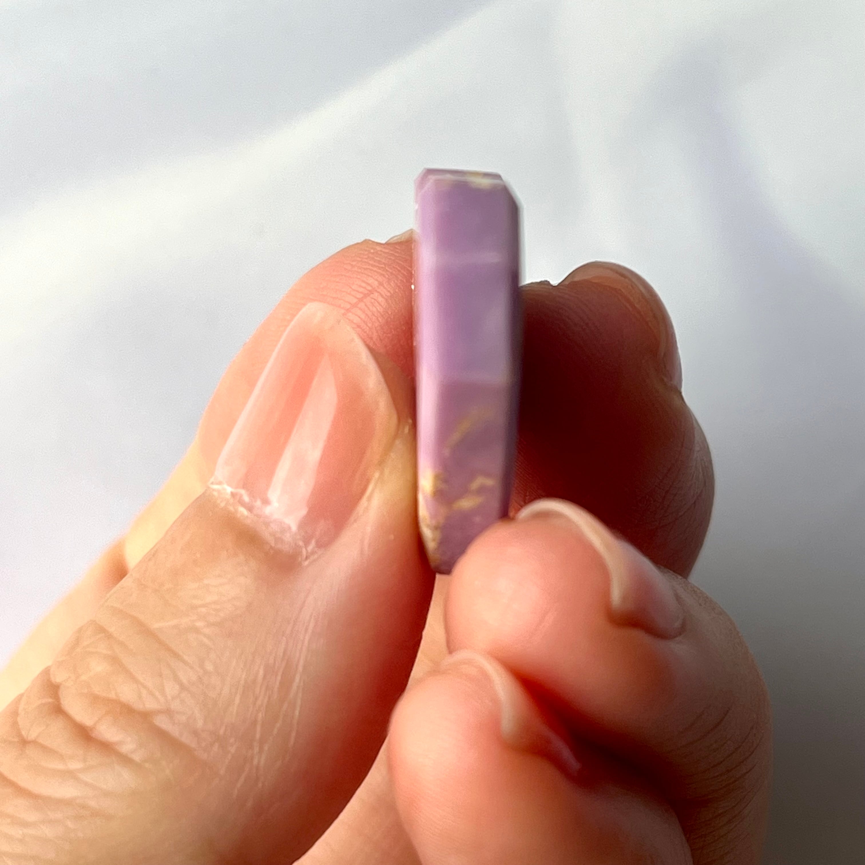 手に取ると、優しい紫ピンクの色合いが心をほっとさせてくれます。お守りとして持ち歩くのにもぴったりなサイズです。