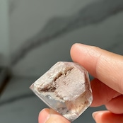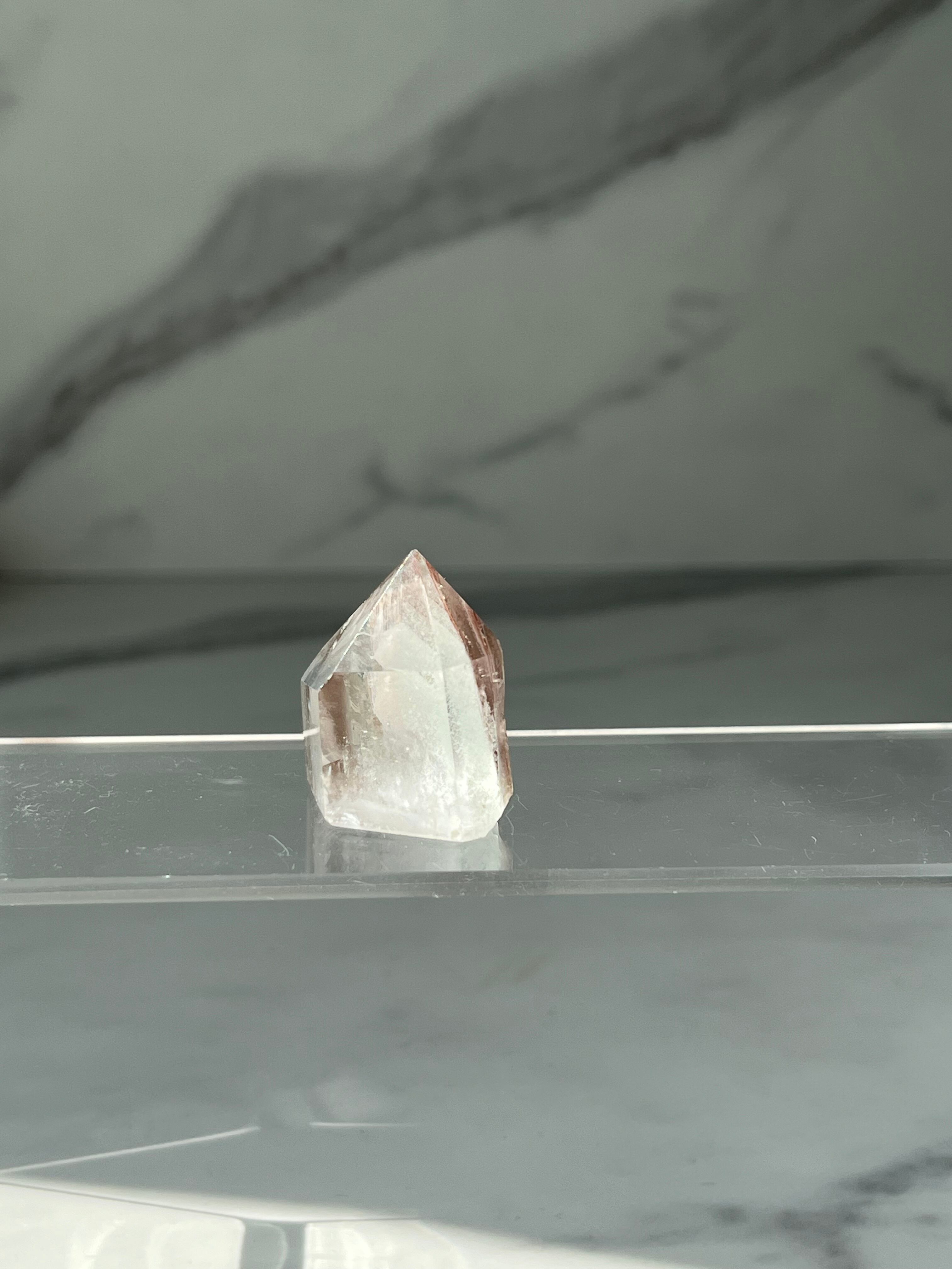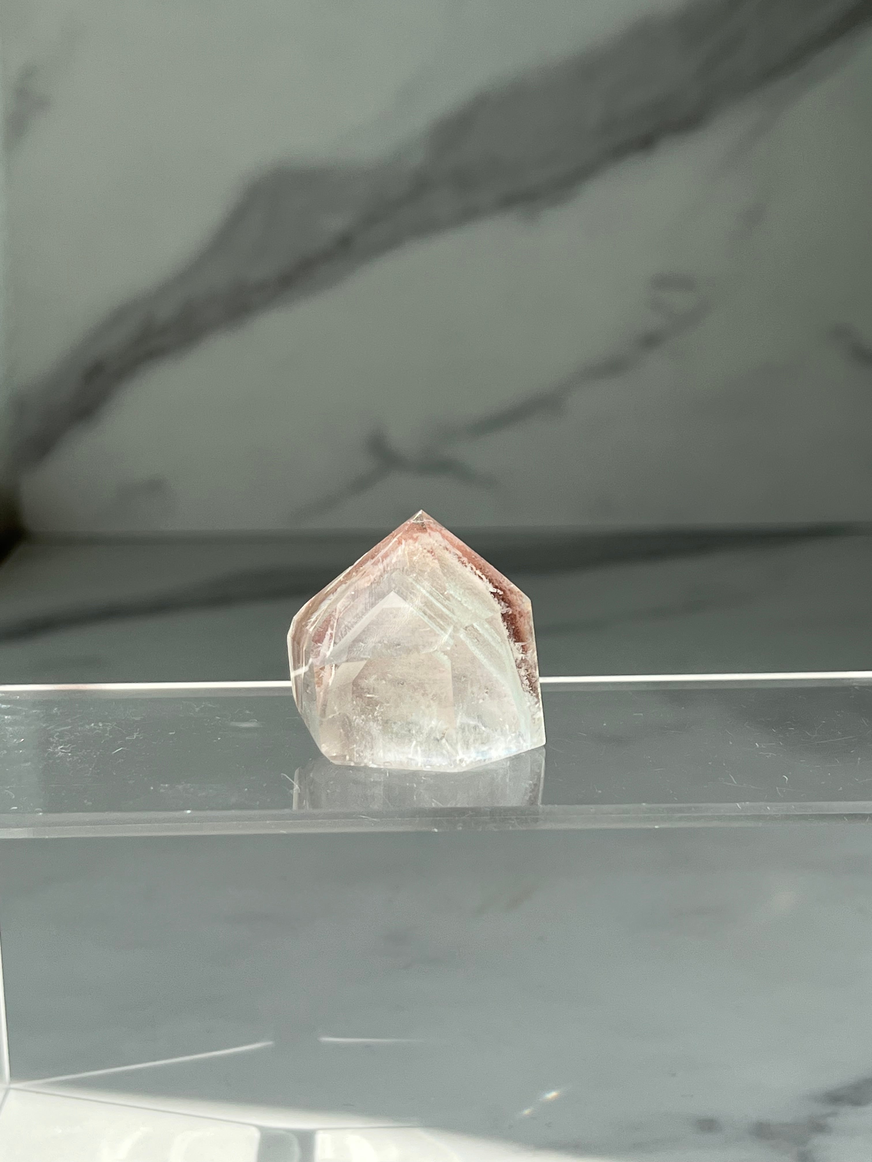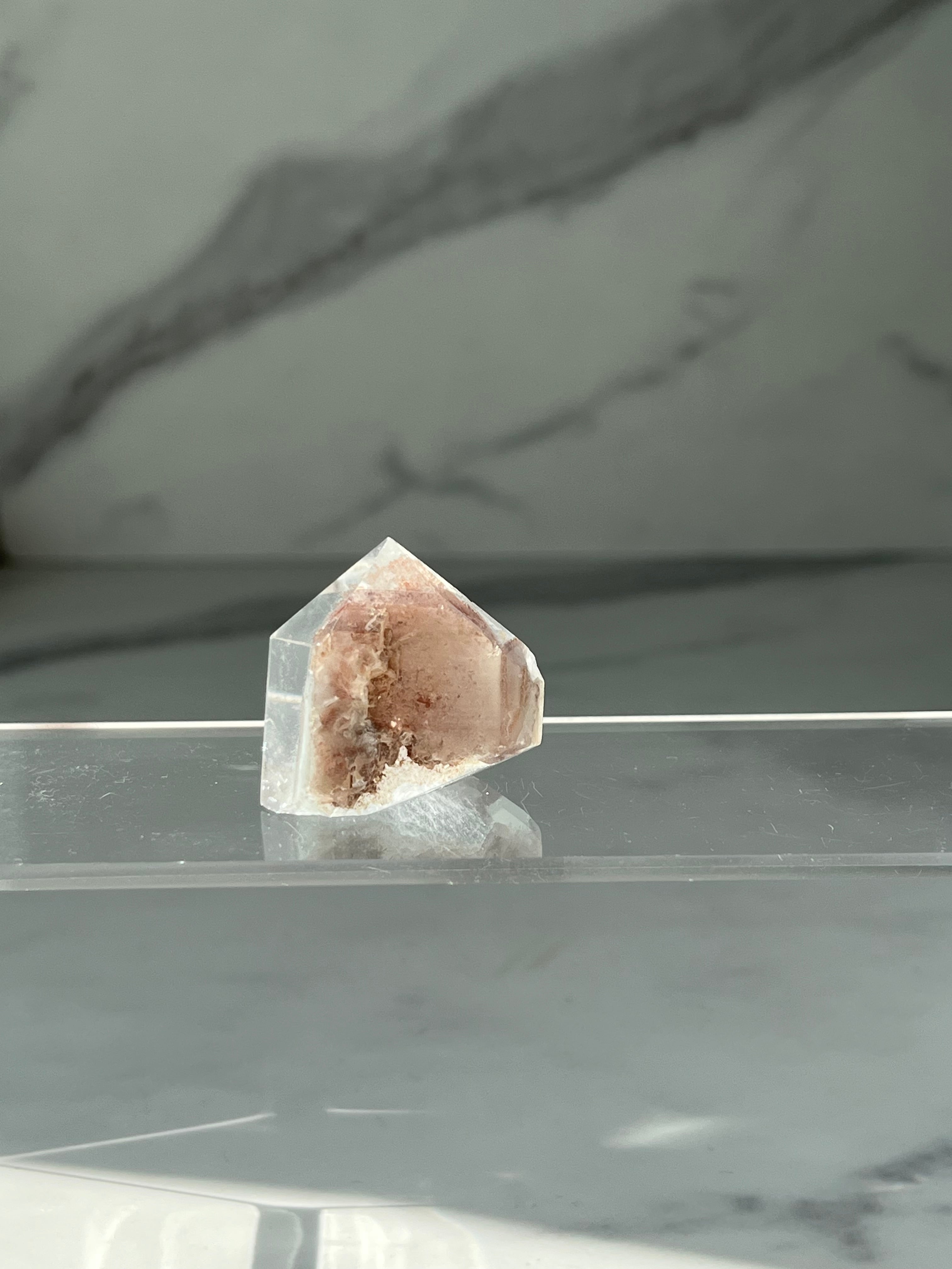 透明感のあるクリアクォーツの中に、ふんわり淡いピンク色のファントムが重なった、小さな癒しの天然石。