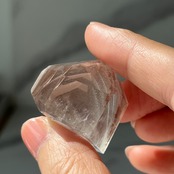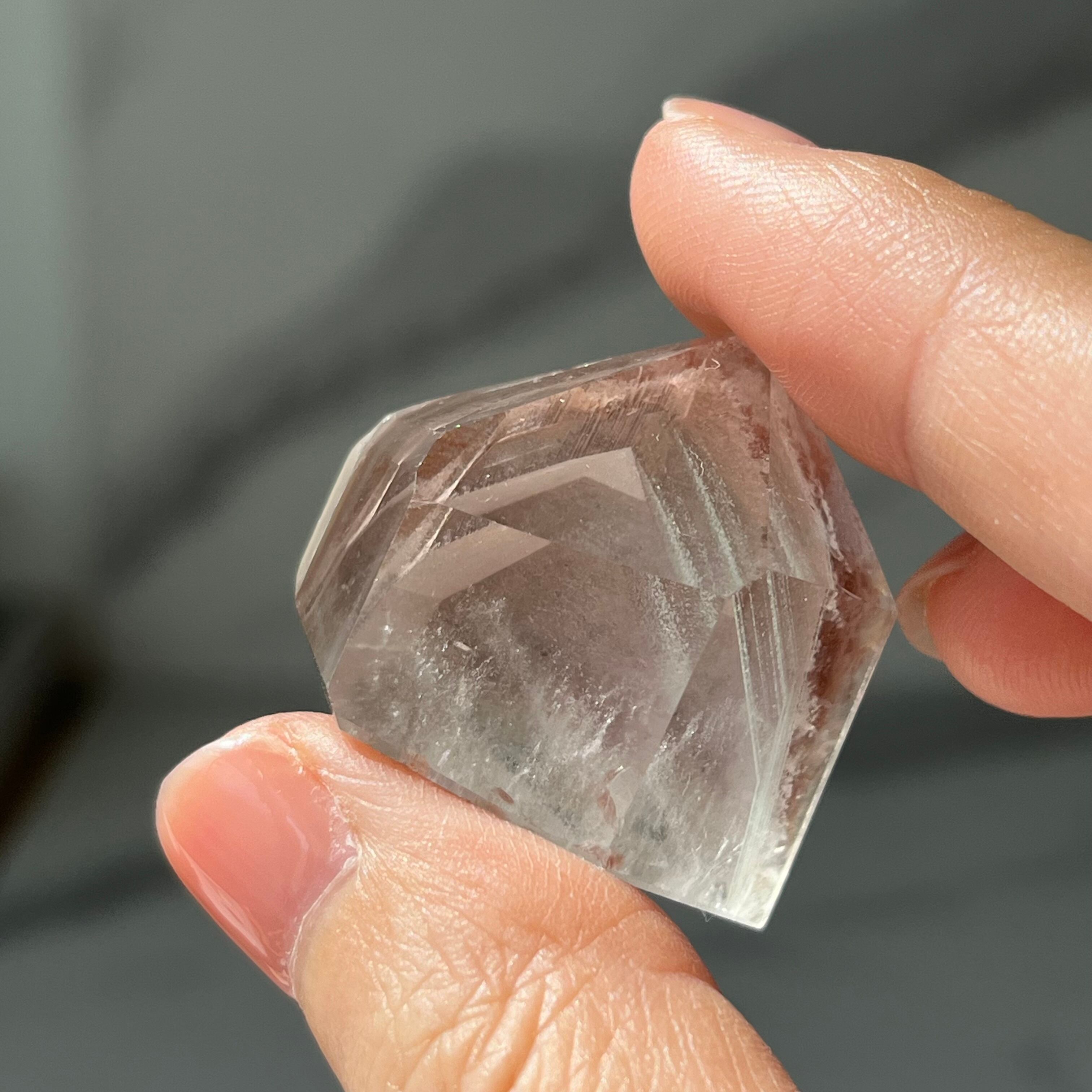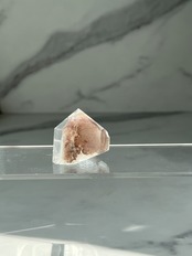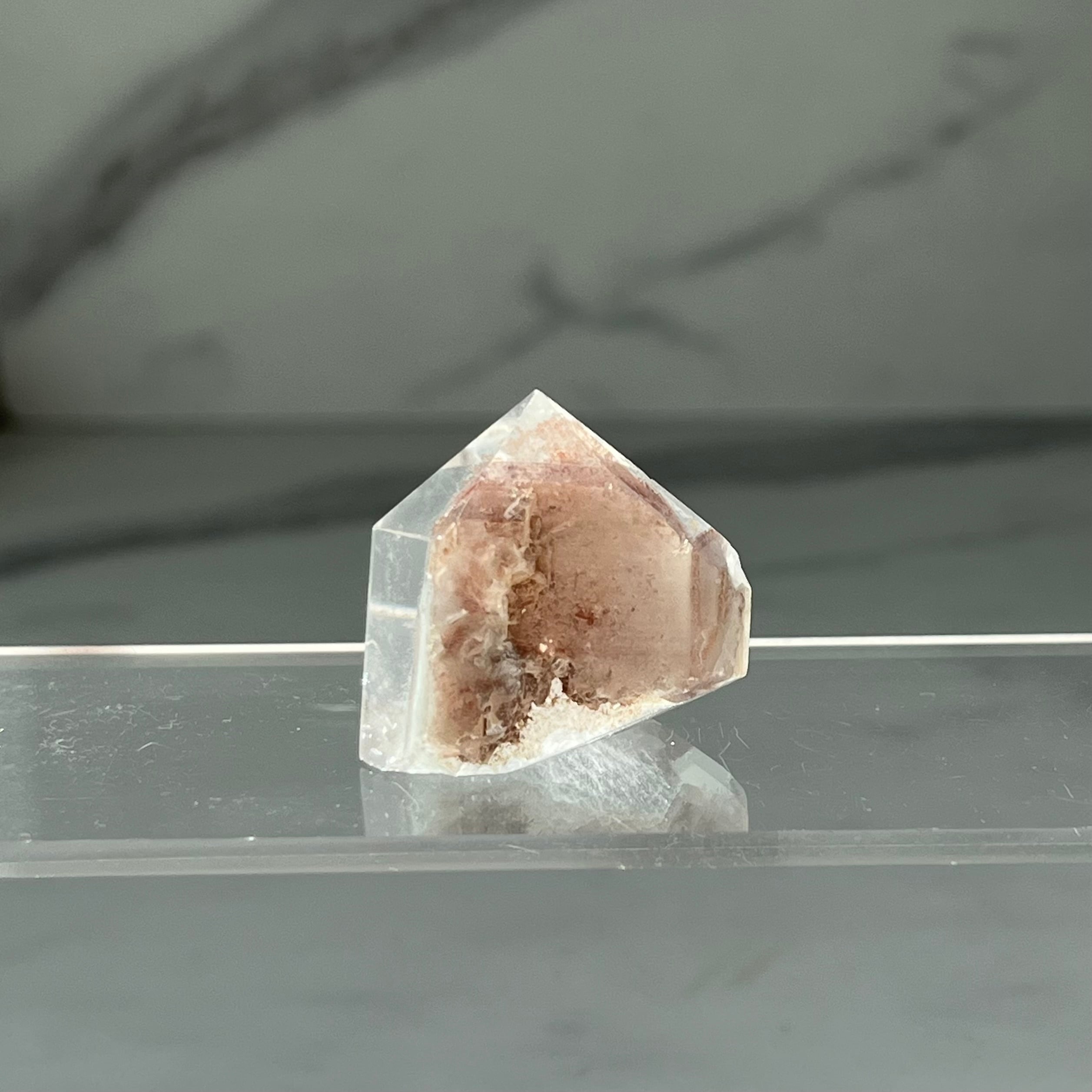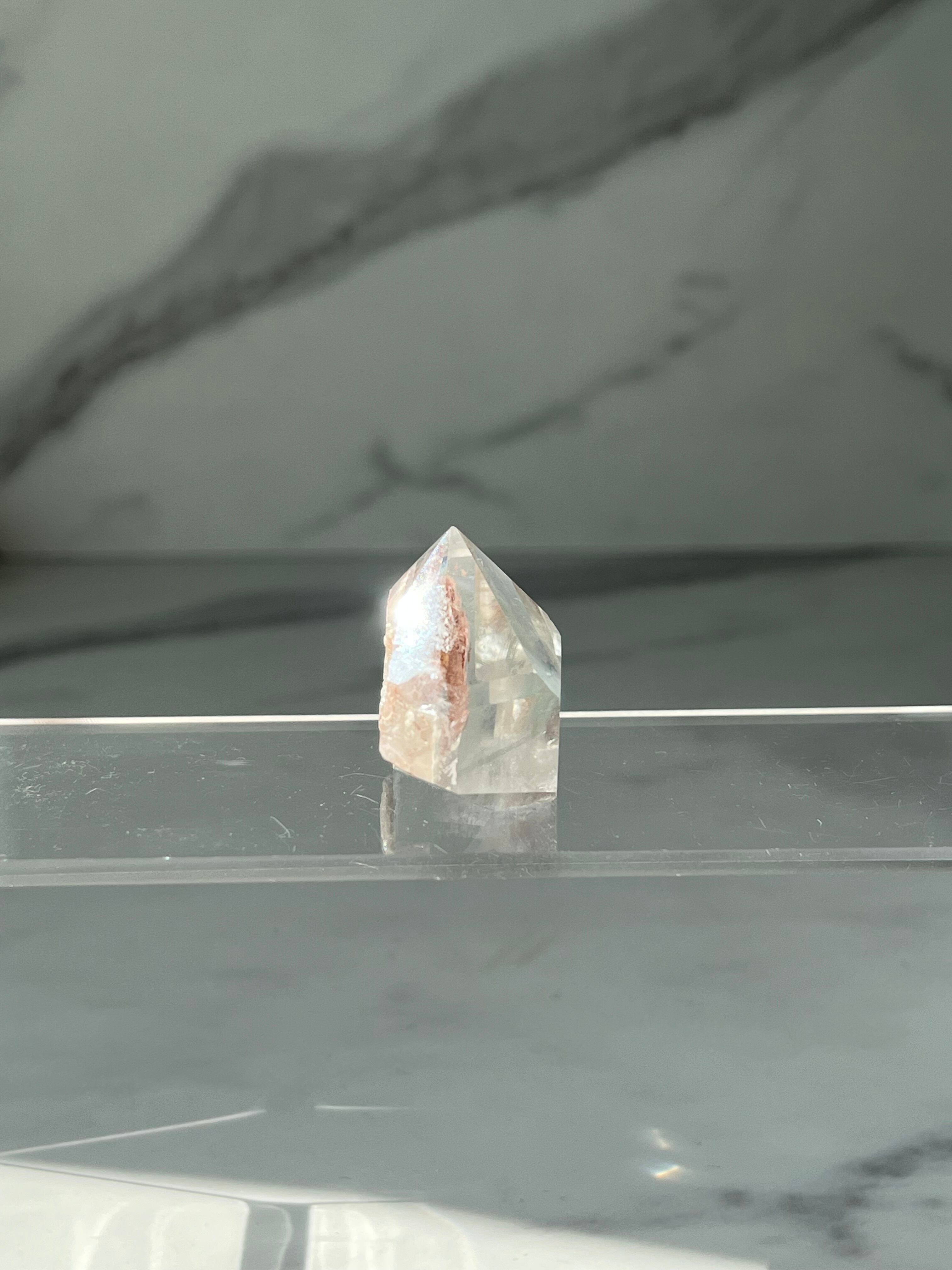 透明感のあるクリアクォーツの中に、ふんわり淡いピンク色のファントムが重なった、小さな癒しの天然石。