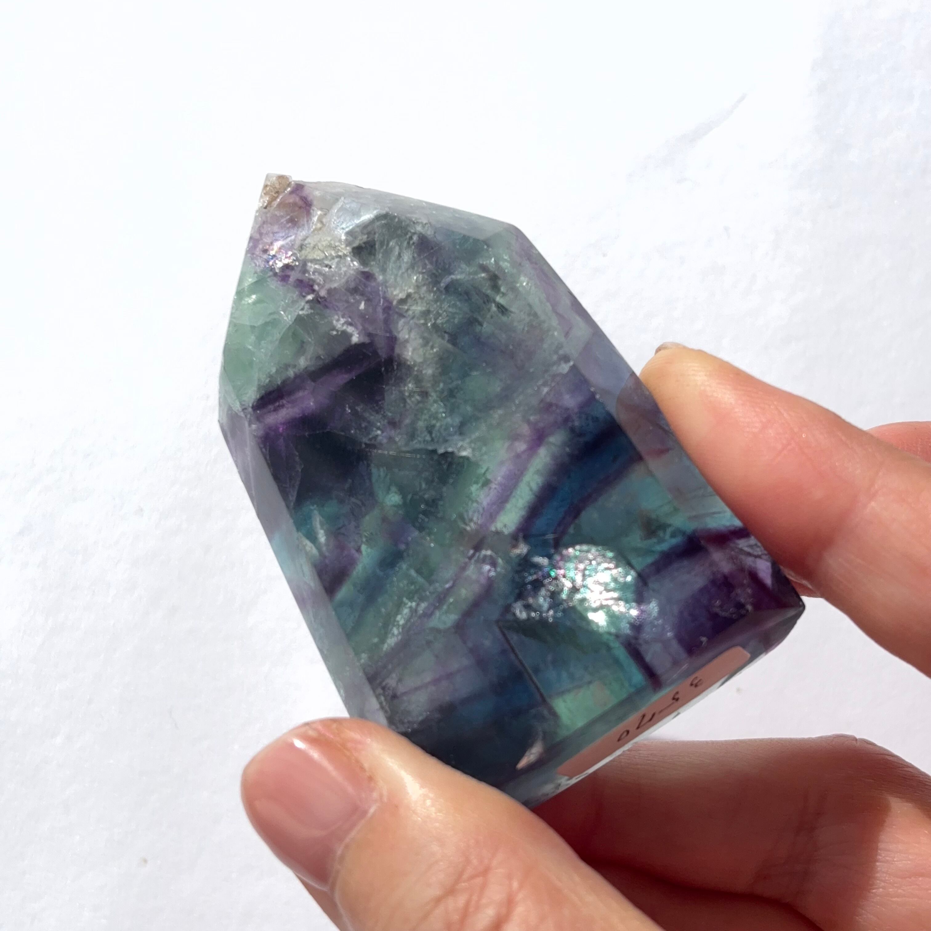 グリーンとパープルが織りなす、幻想的なバイカラーフローライトのタワー。