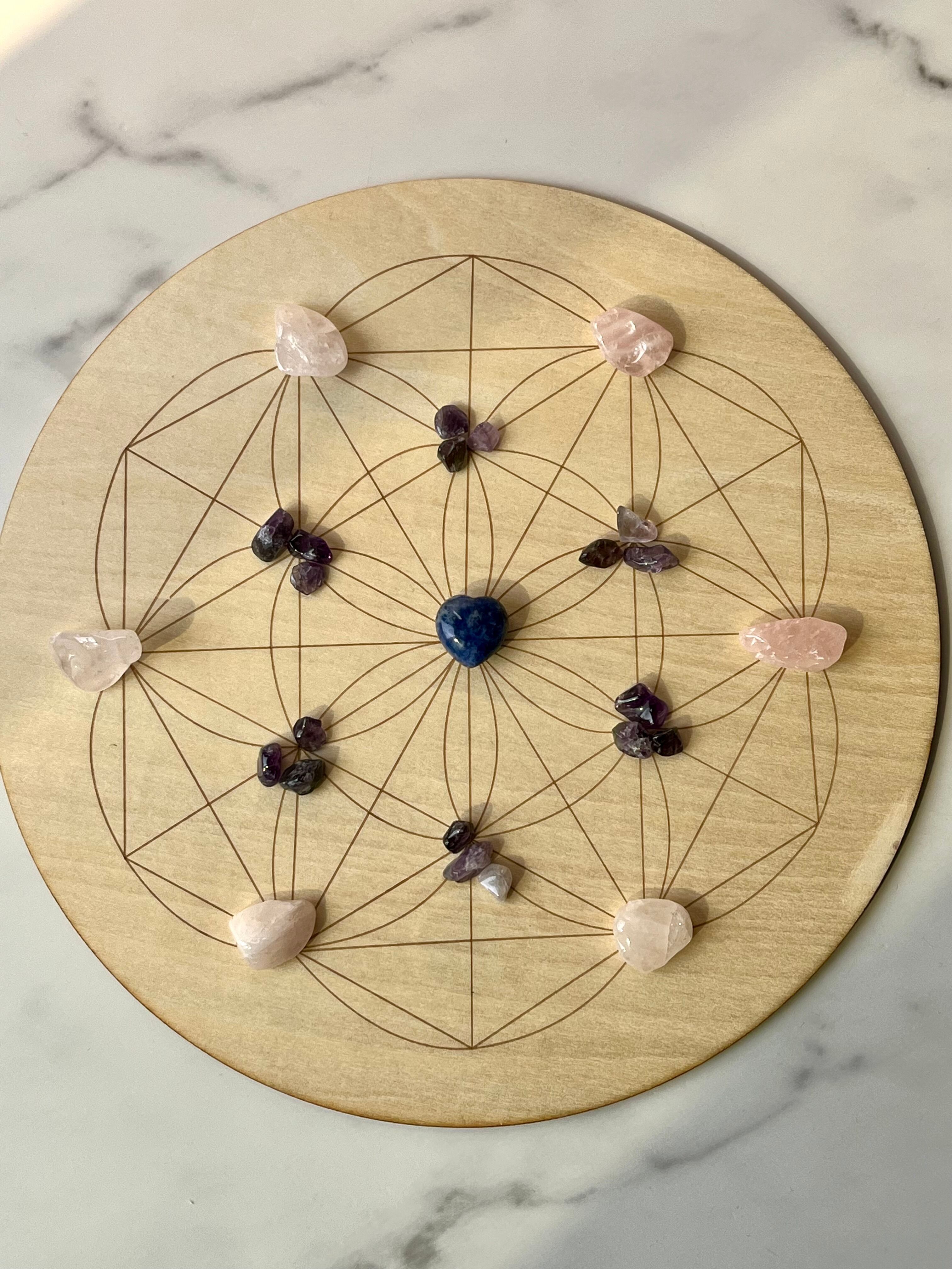 シード・オブ・ライフの模様は「創造」「生命エネルギー」「新しい始まり」を象徴しているので、グリッドに使うことで、願い事の「種」をまき、育て、実らせる流れを後押ししてくれます。