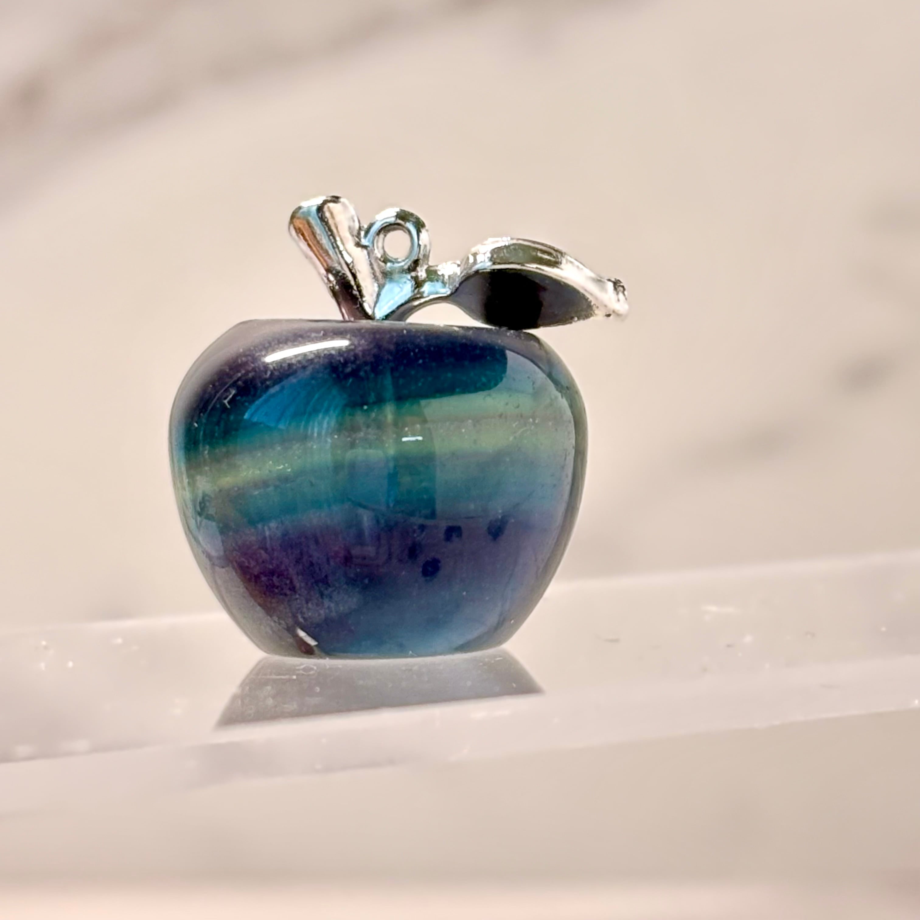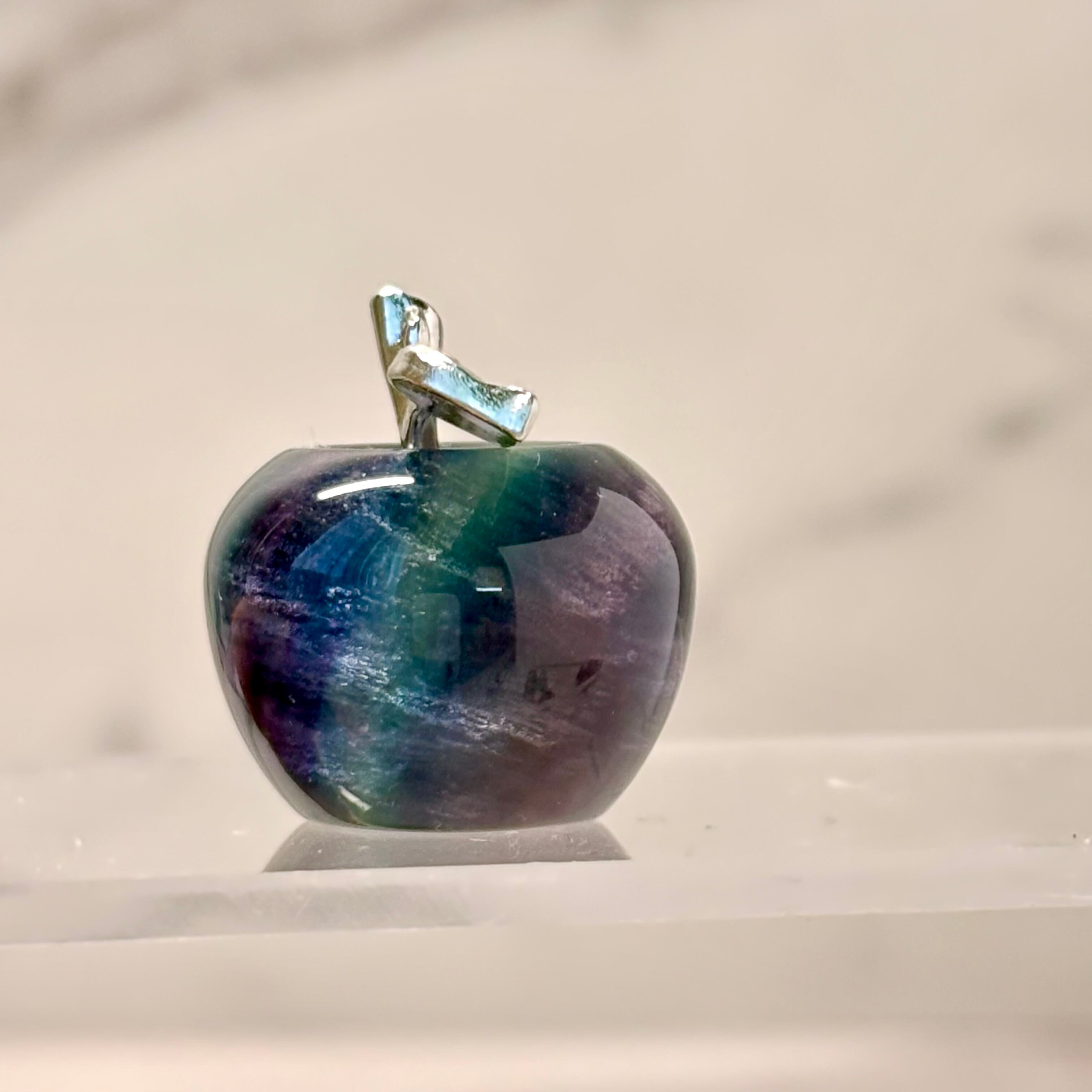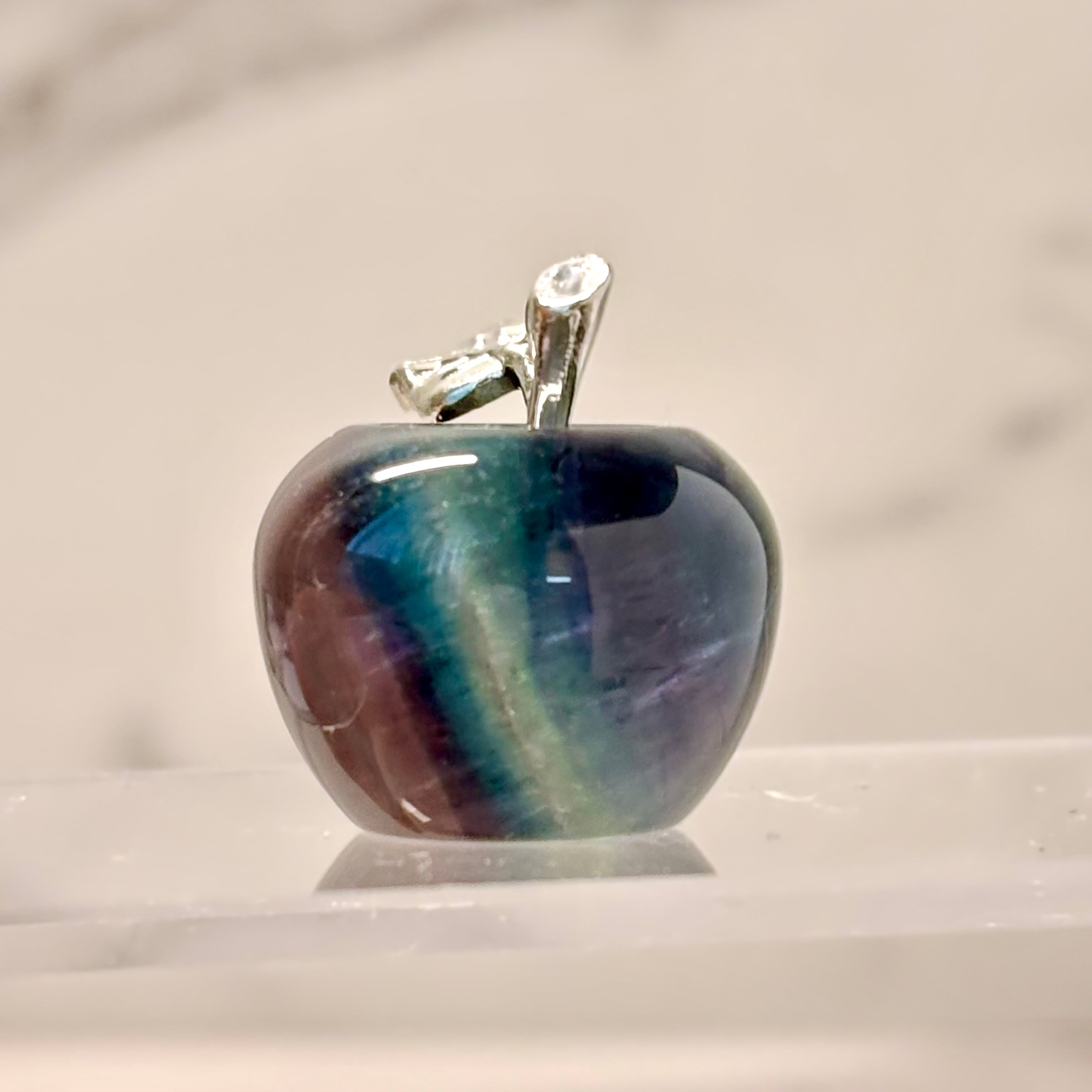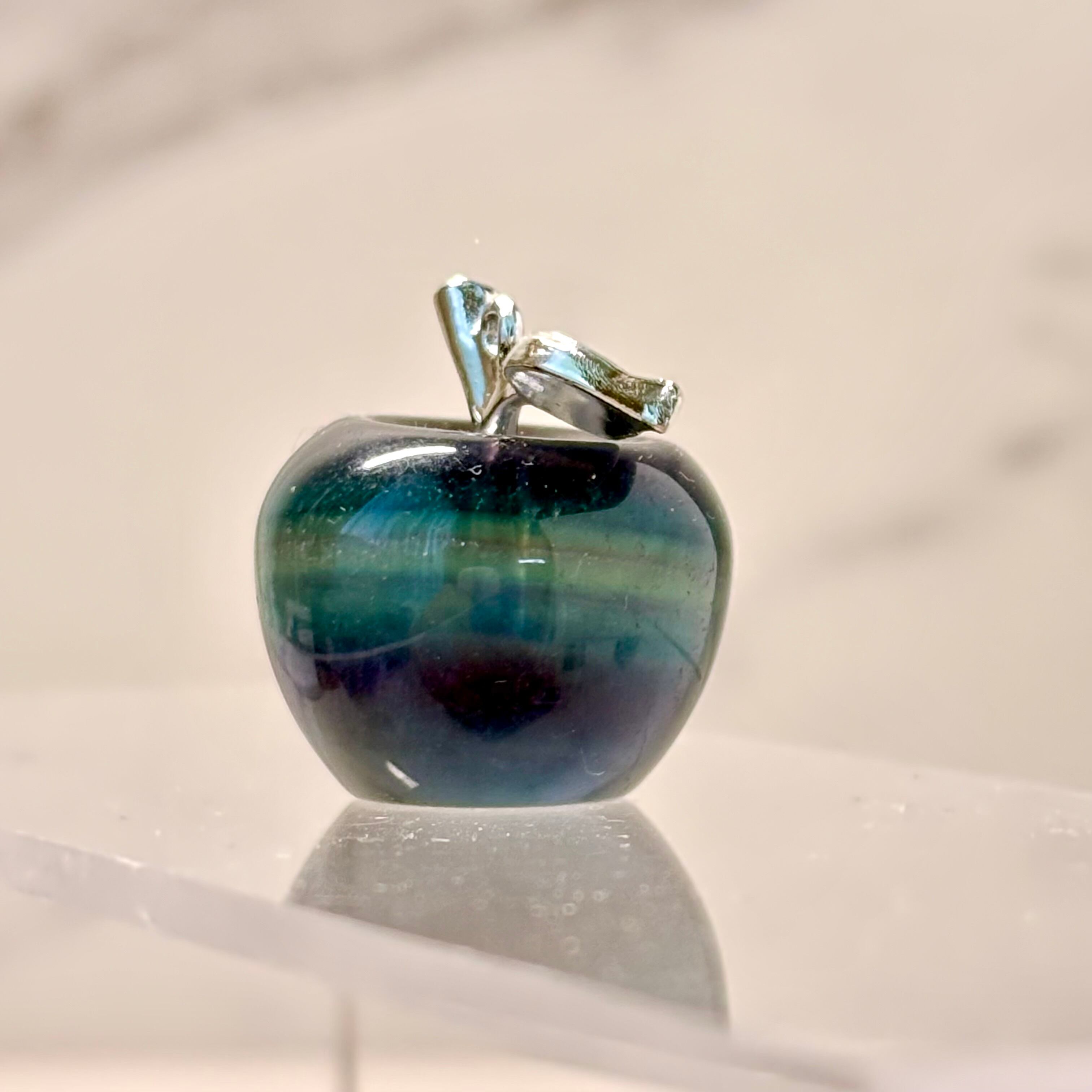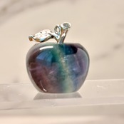 透明感のあるブルーグリーンが美しい、フローライトのリンゴカービング。