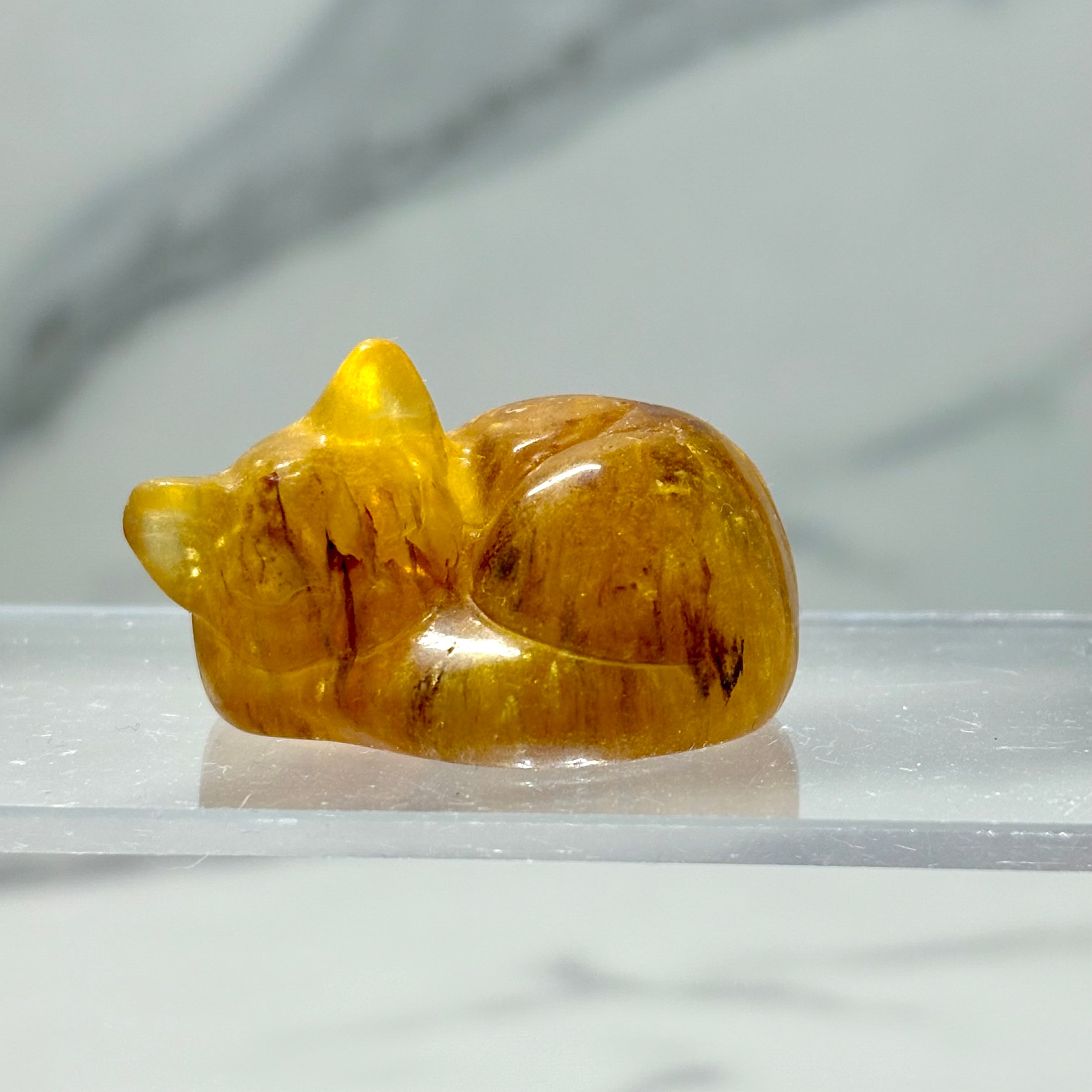 やさしいイエローが美しい、フローライトの猫カービング。
