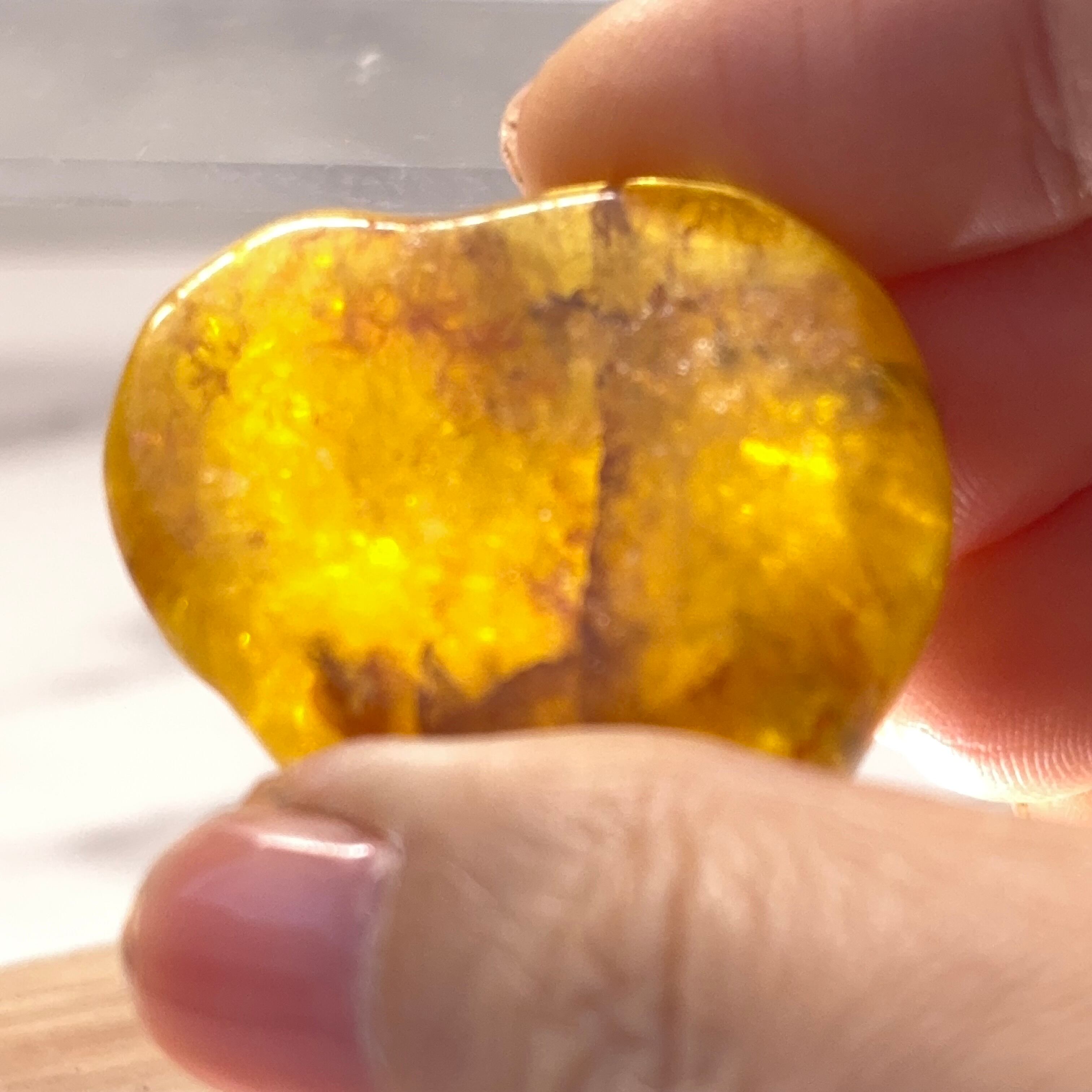 光に当たると、内側から細かなきらめきが浮かび上がり、まるで小さな光の粒が踊っているよう。