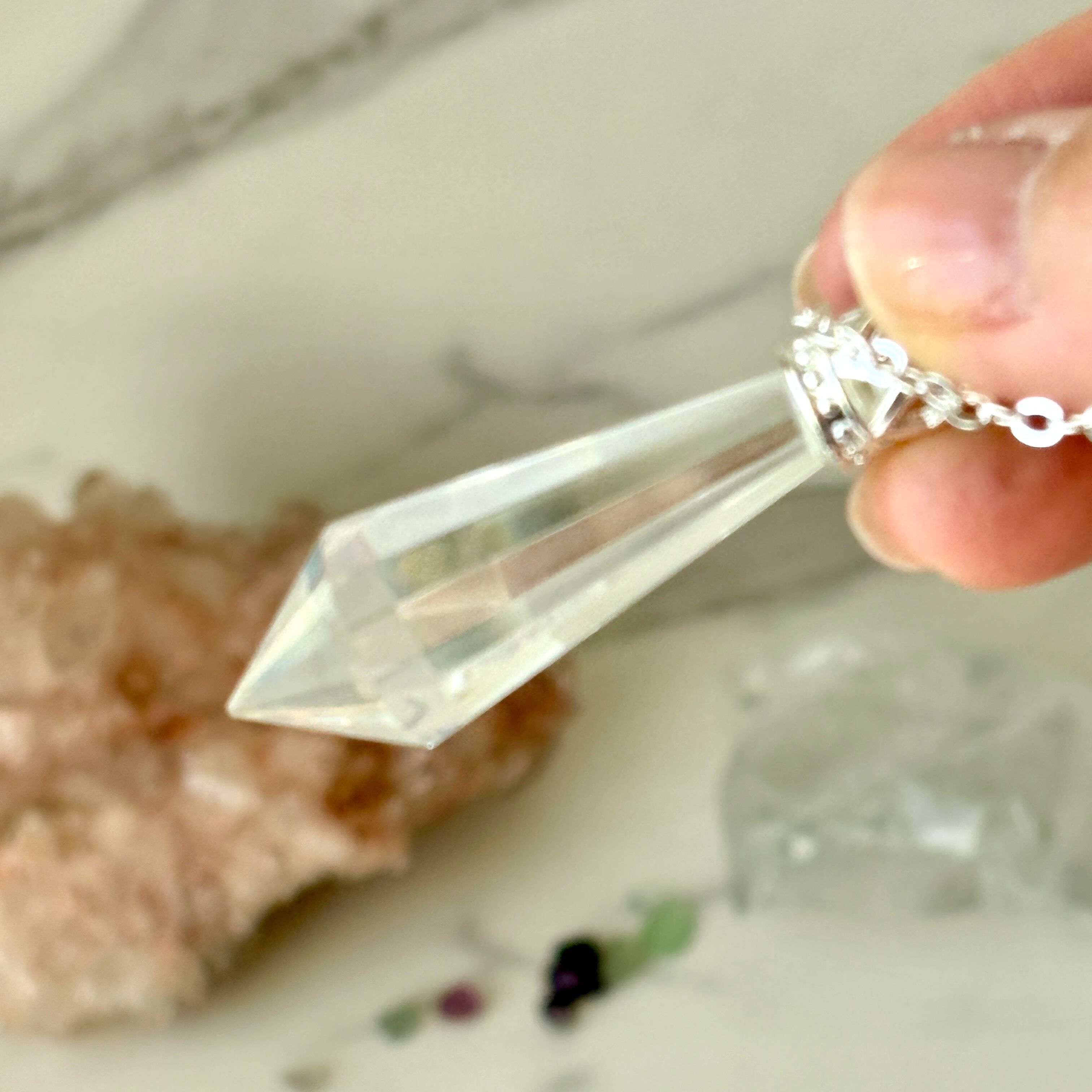 透明感のあるクリアクォーツのペンデュラムに、