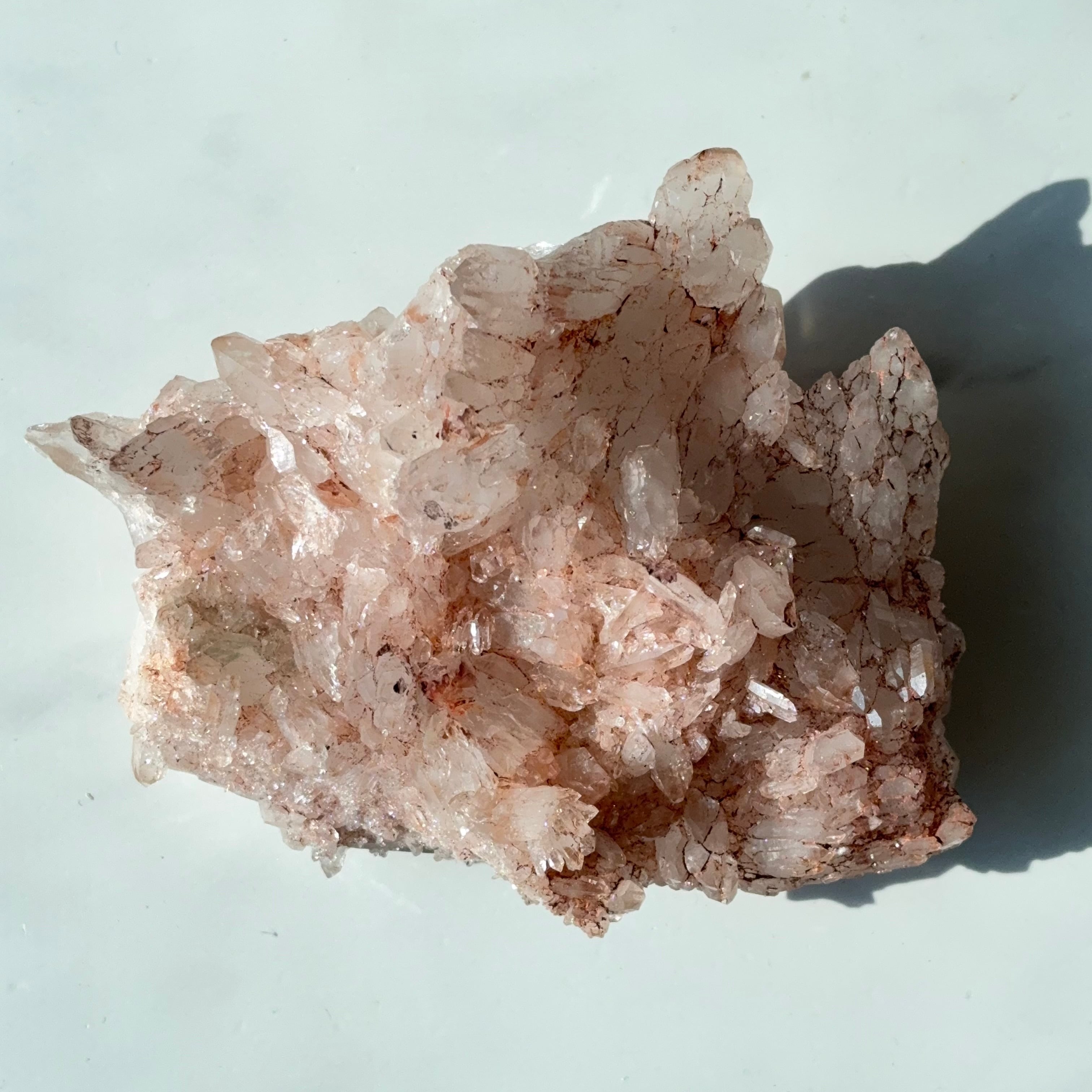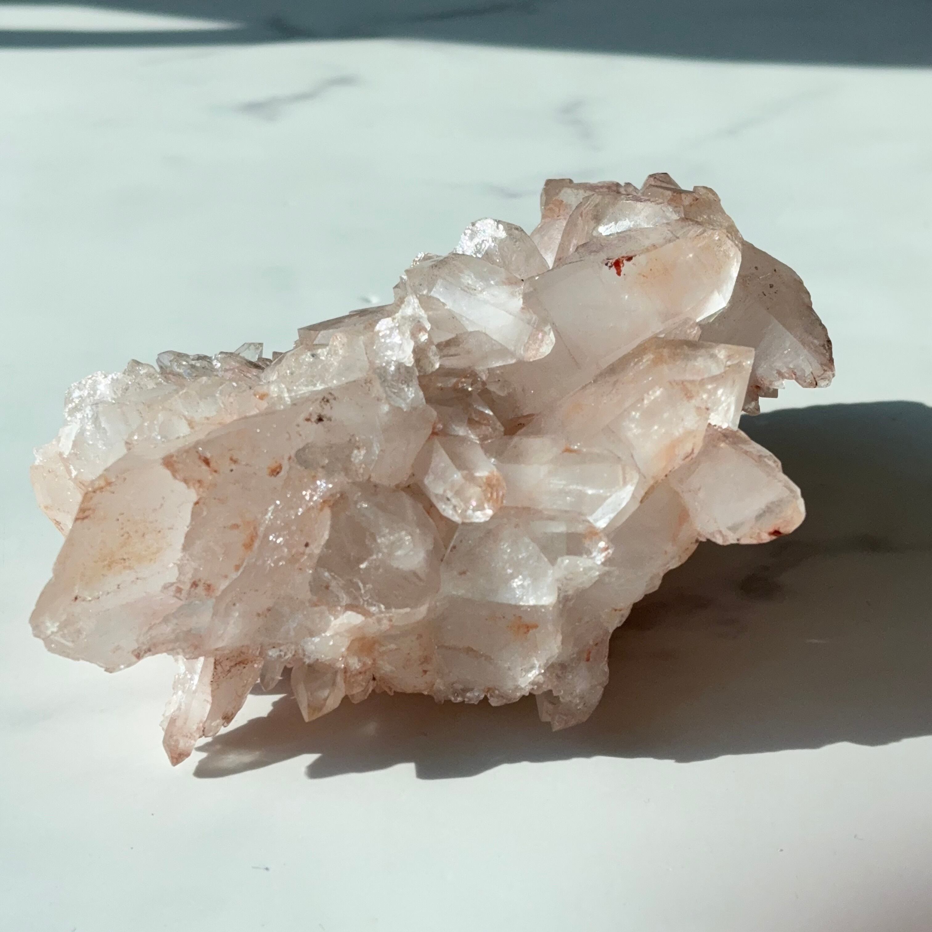結晶が重なり合う自然なフォルムと、ほんのりとしたピンクの色合いが可愛らしく、原石ならではの存在感を感じられる特別な一点もの。
