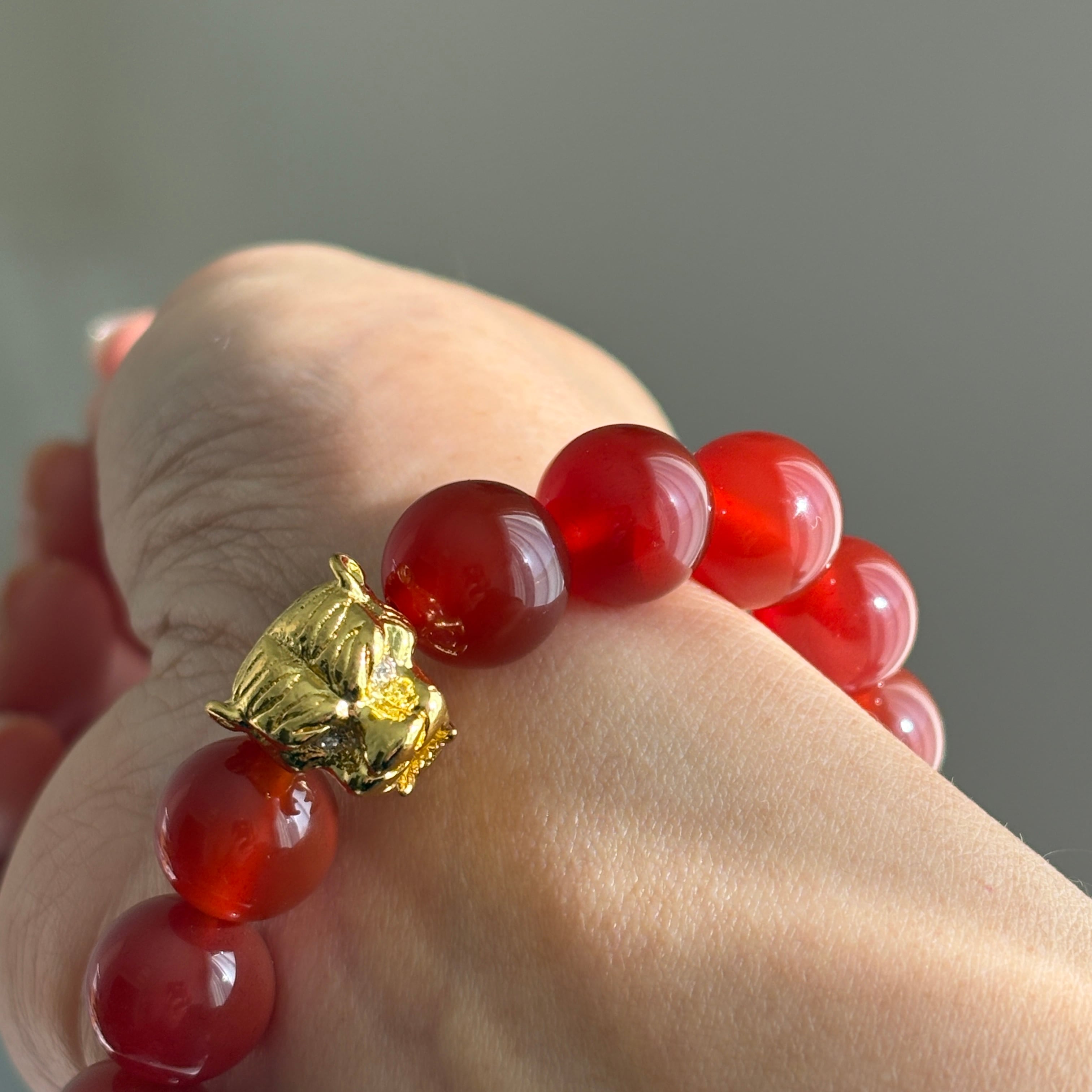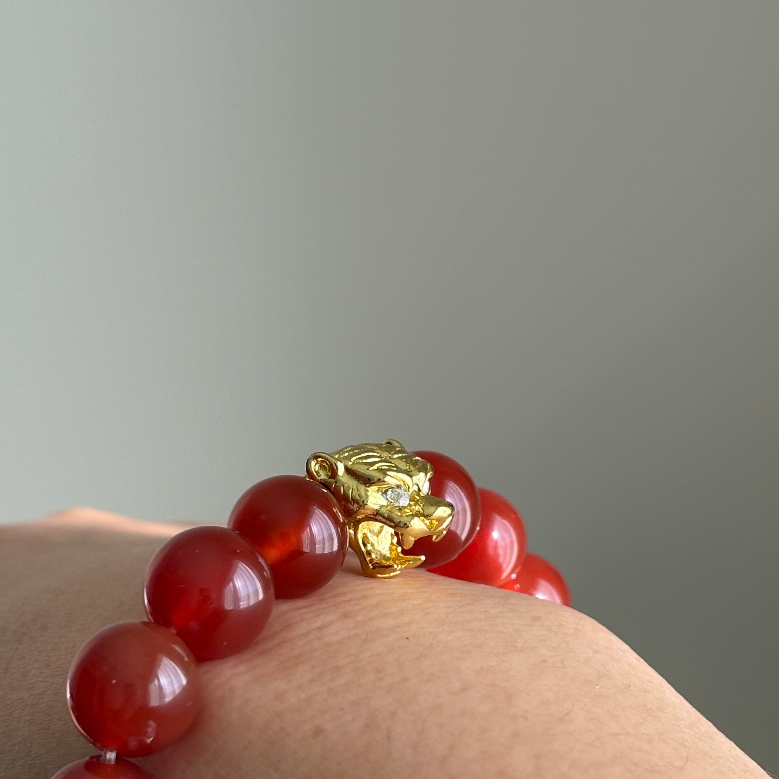 深みのある赤が印象的なカーネリアンに、力強さの象徴であるタイガーヘッドを合わせたブレスレットです。