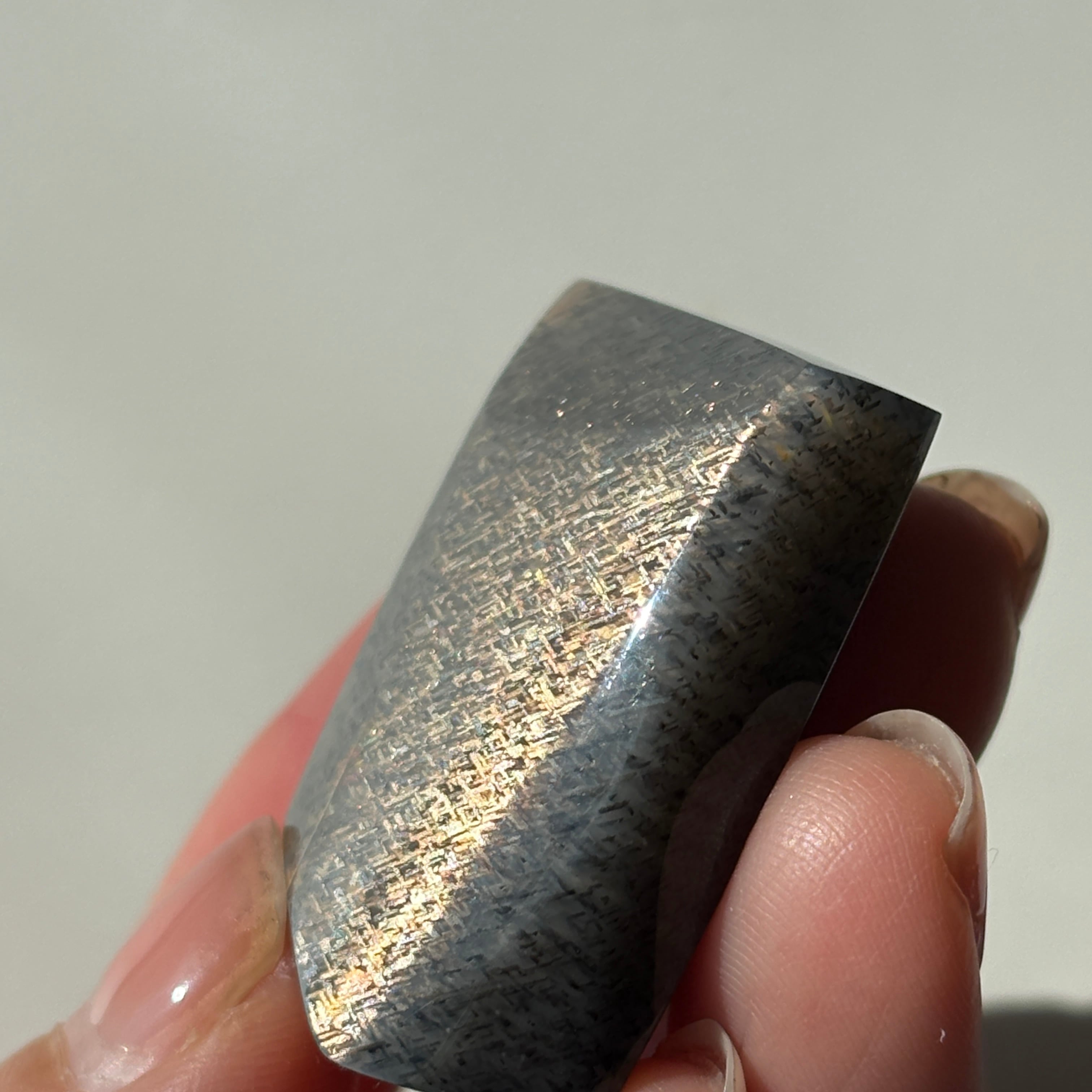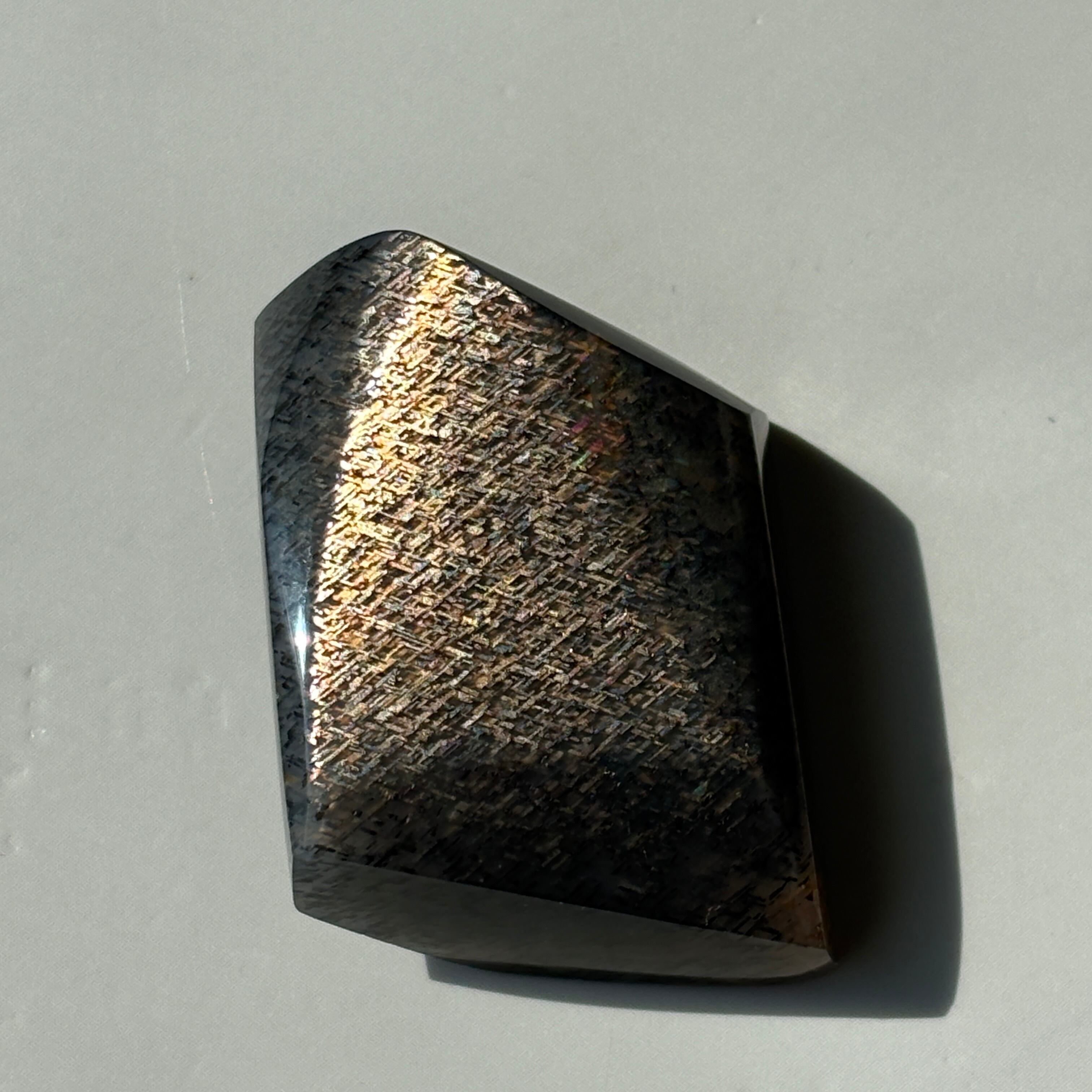 虹色にきらめくはしごのような格子状の輝きが現れる非常に特徴的なサンストーンです
