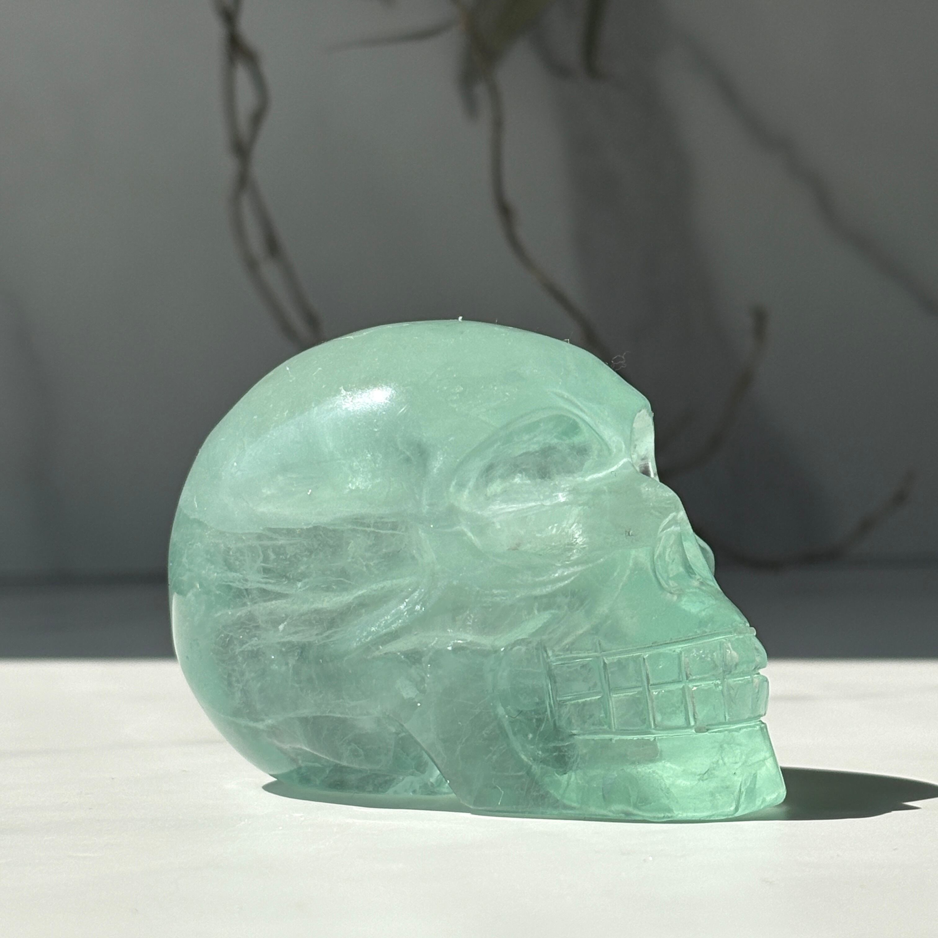 グリーンフローライト スカル2|虹入り レインボー フローライト彫刻|天然石ドクロ・鉱物インテリア