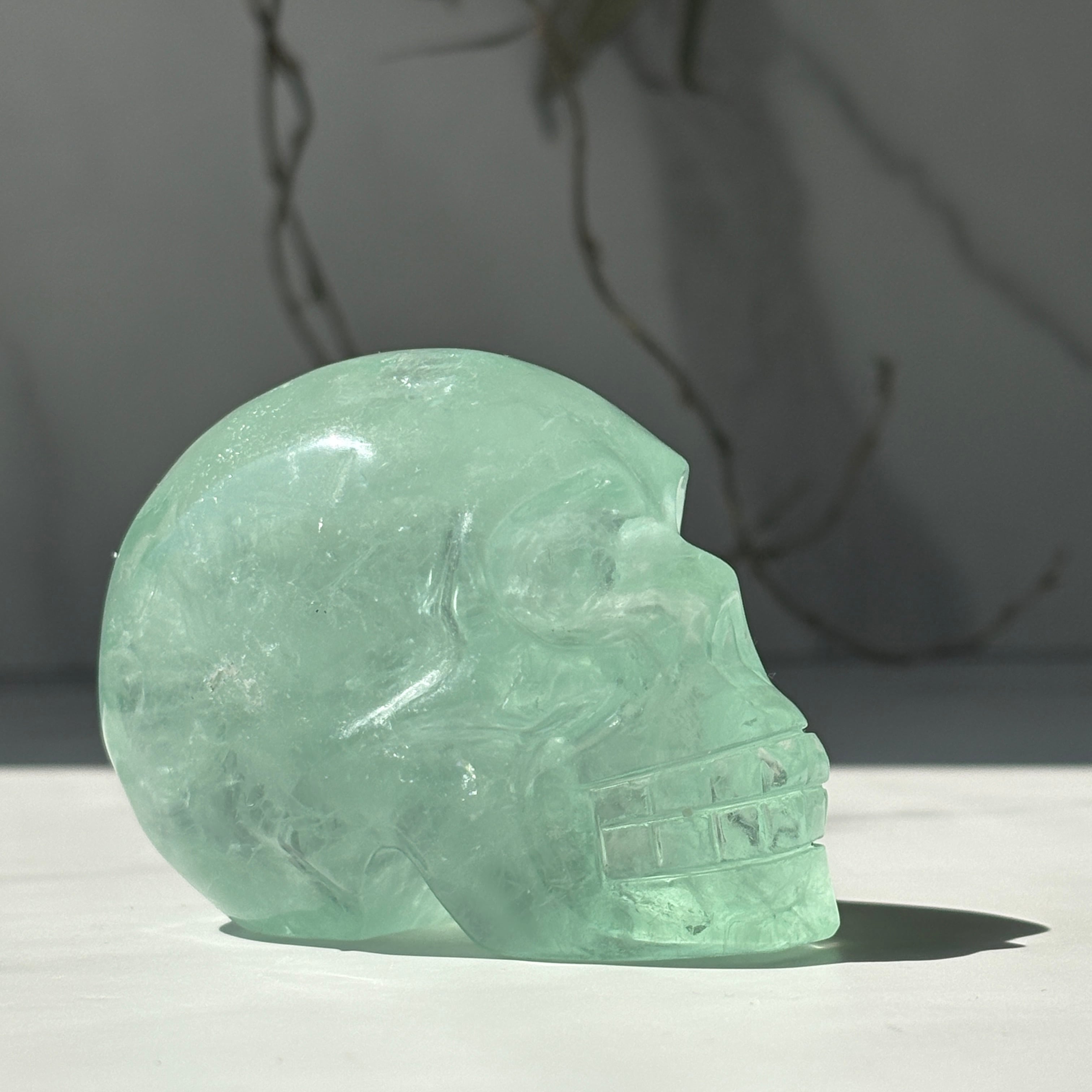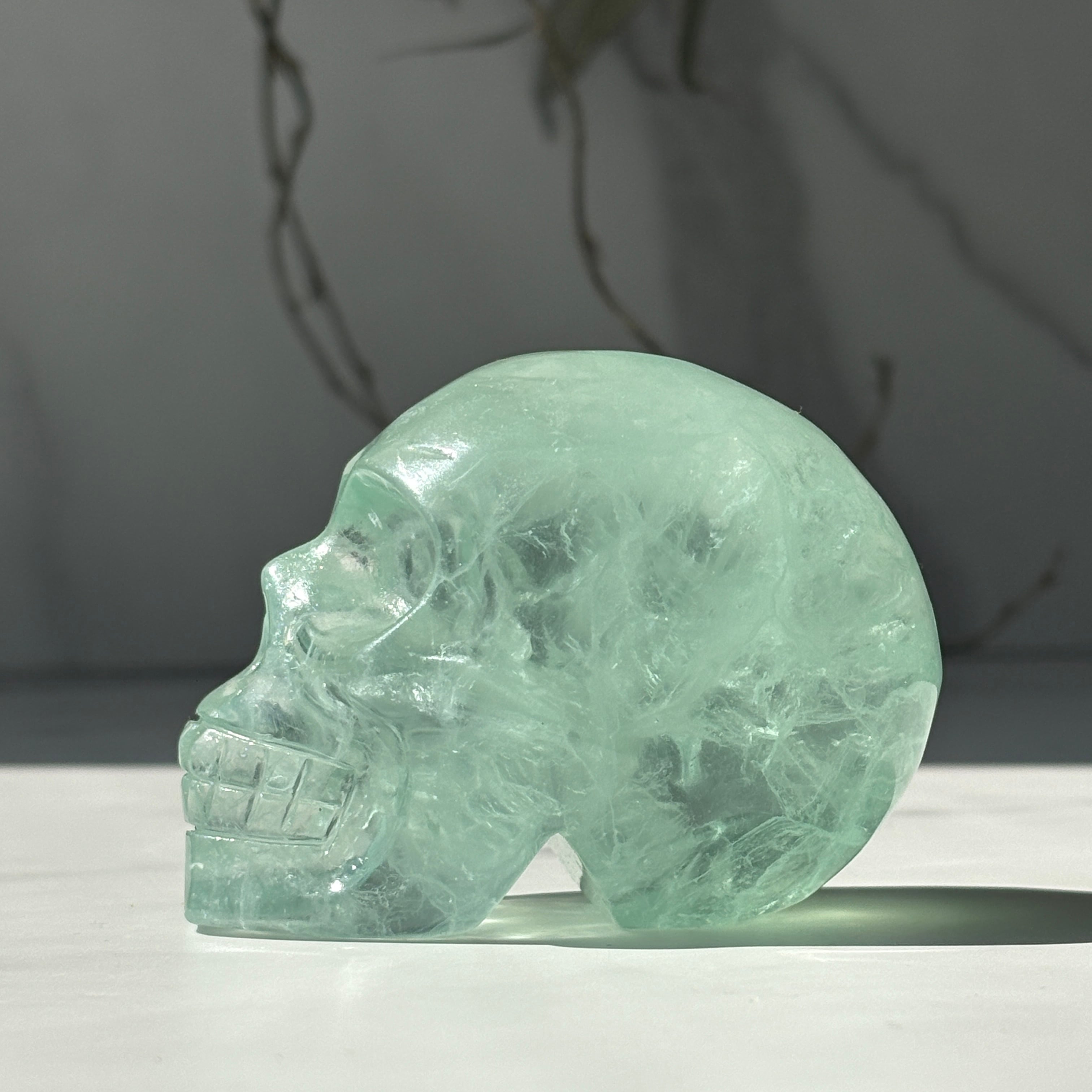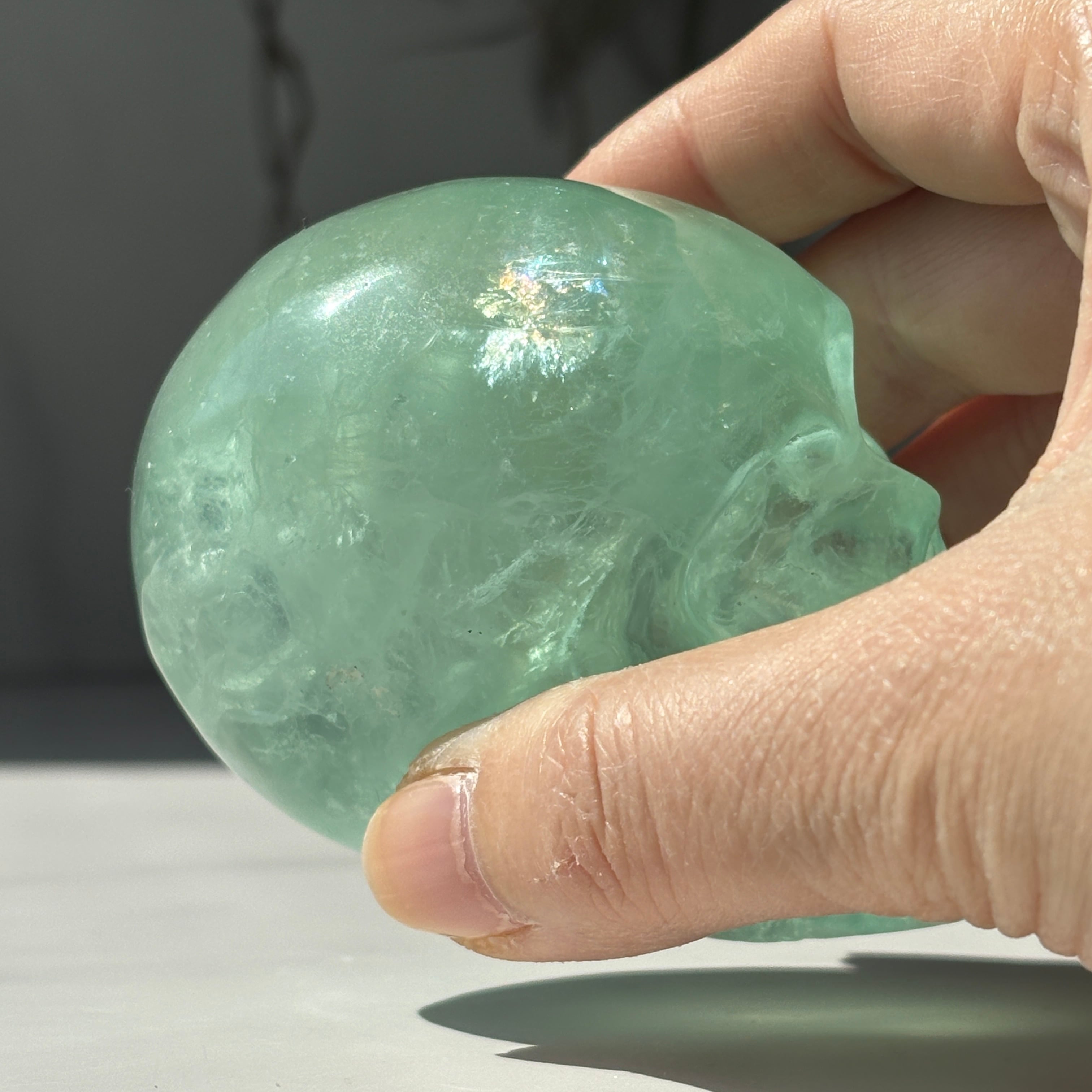 グリーンフローライト スカル3|虹入り レインボー フローライト彫刻|天然石ドクロ・鉱物インテリア