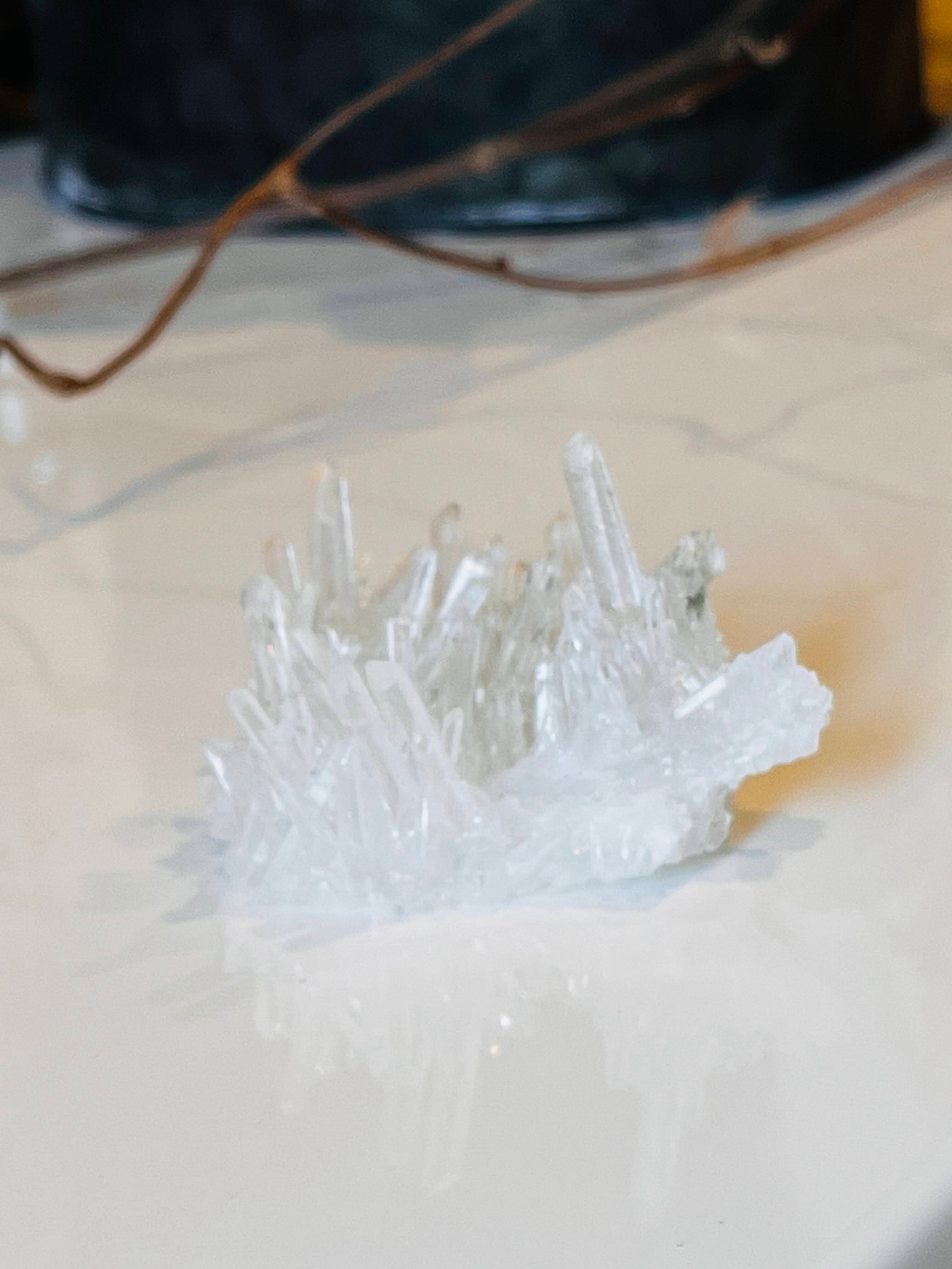 ブルガリア南部、水晶の主たる産地であるMadanで採れた水晶クラスターです。結晶表面がすりガラス状になっているのはブルガリア産水晶に多くみられる特徴です。また、個性的な結晶をしているものが多く結晶は細長いものが多いのが特徴です。