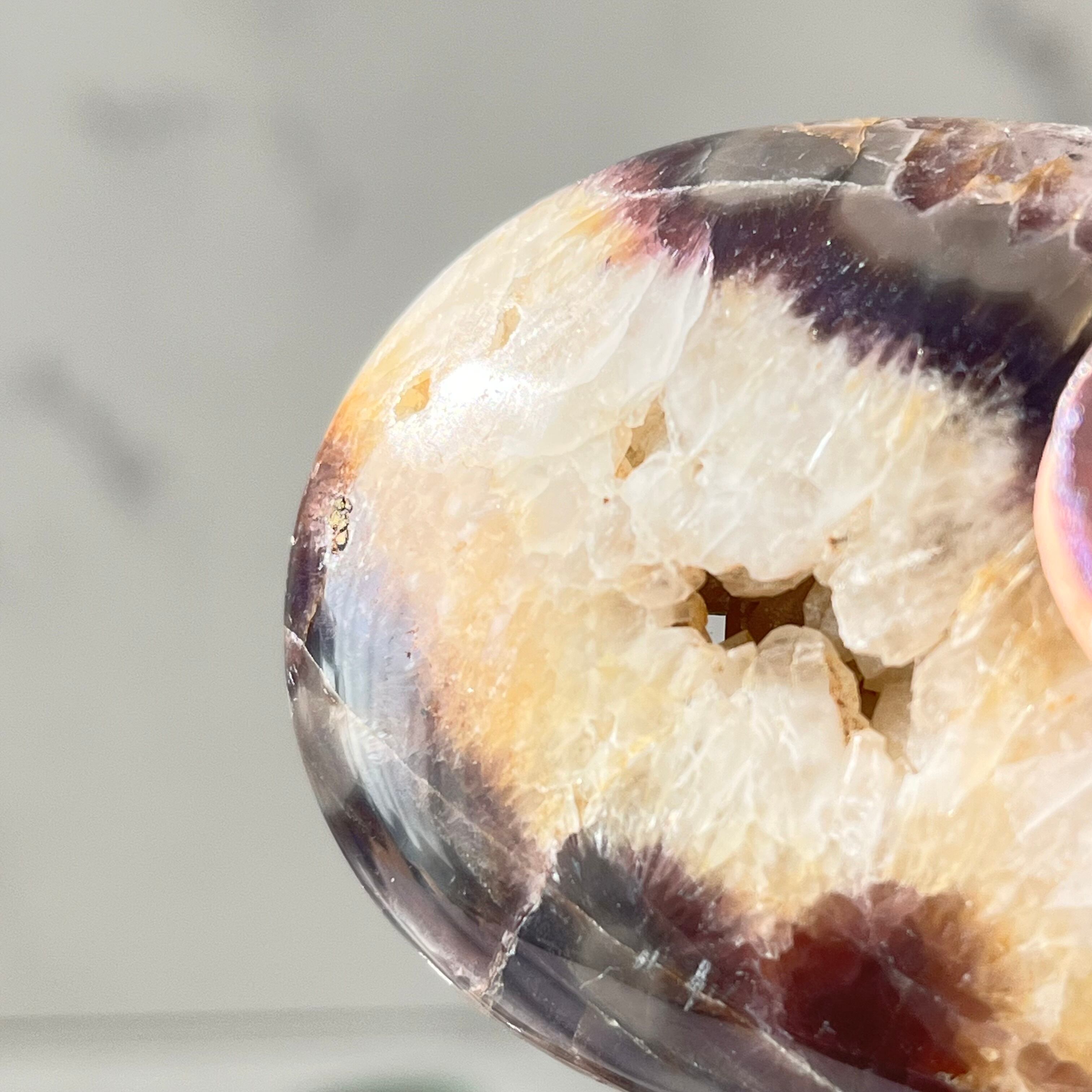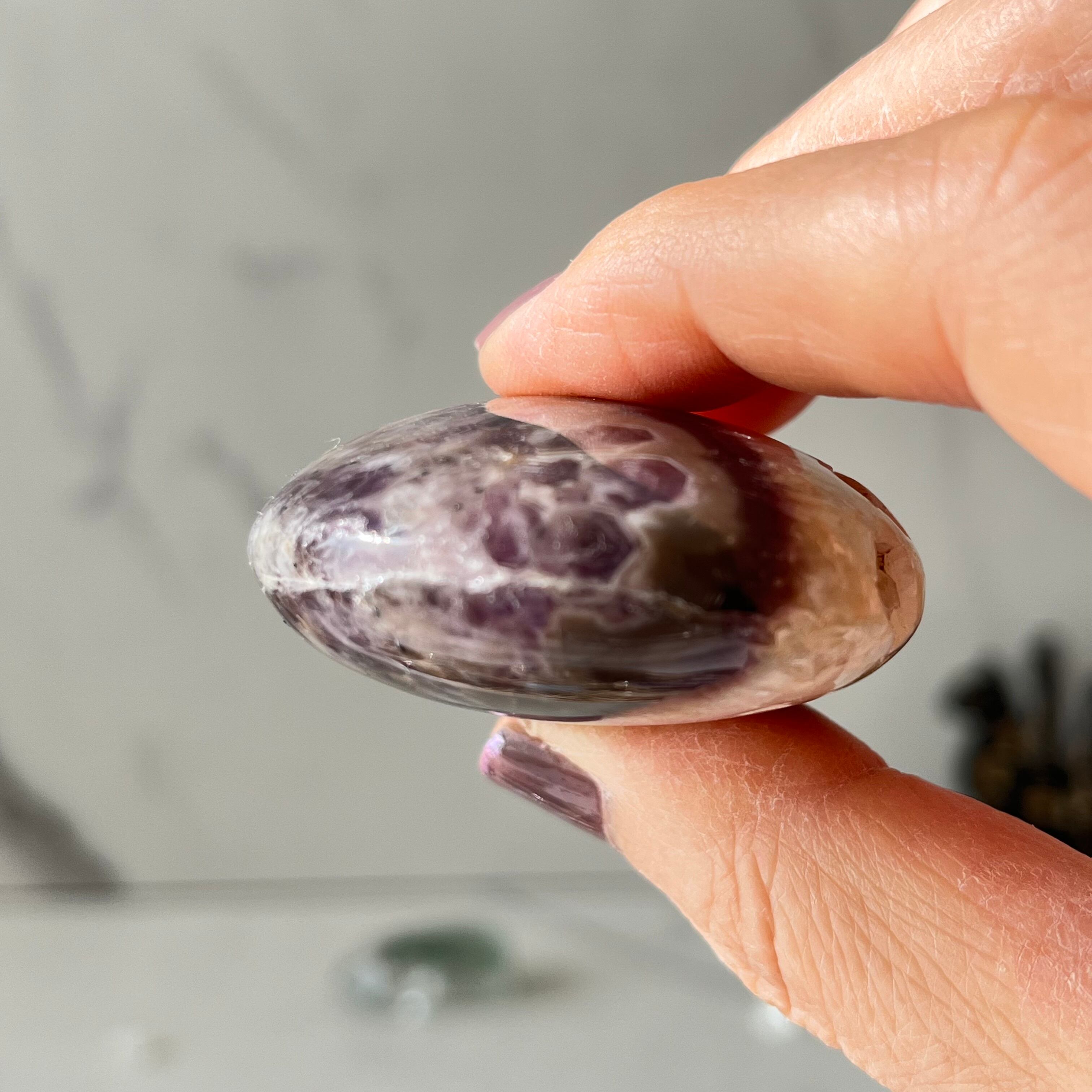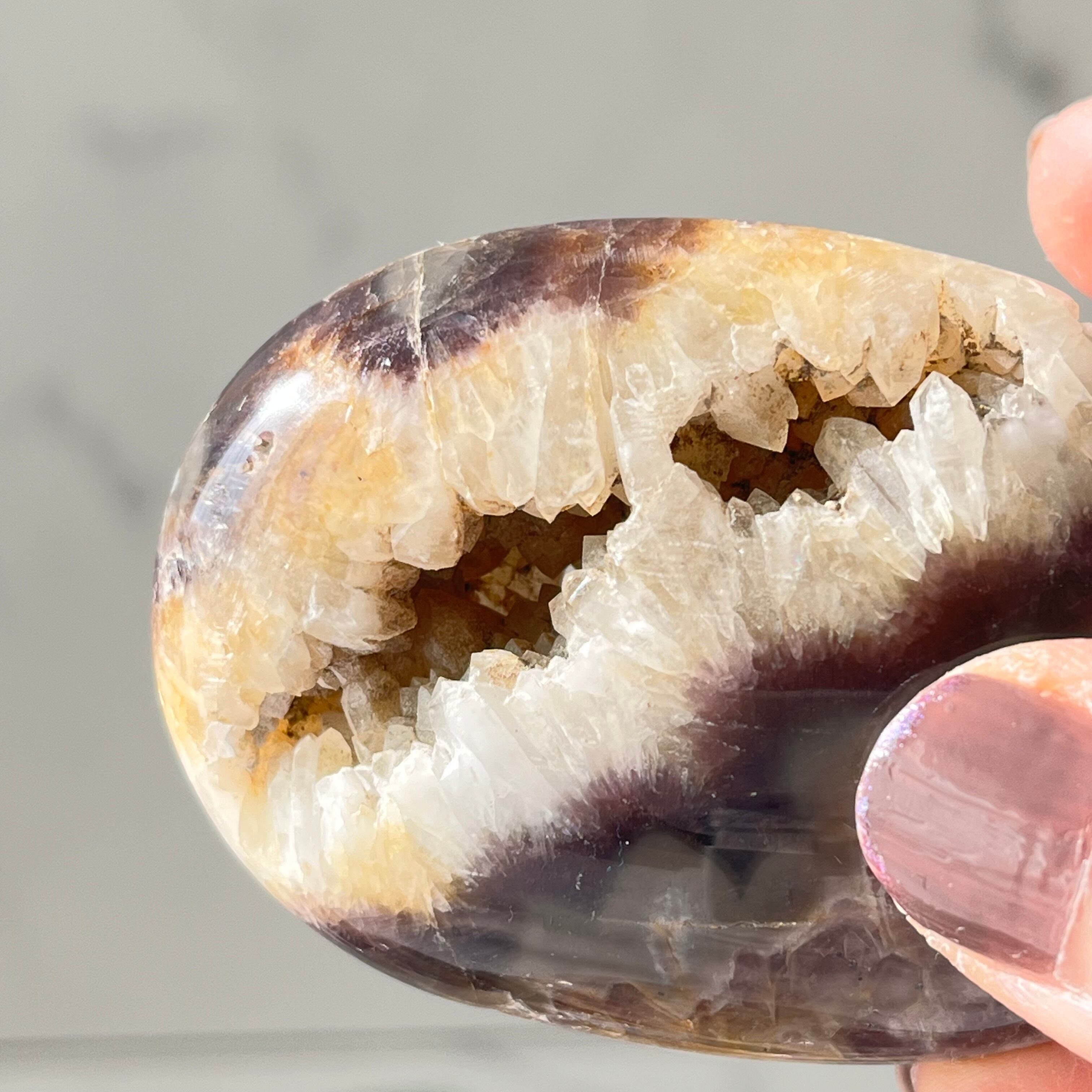 大きなザクザクドゥルージーが個性的なインドネシア産のアメジストのパームストーンです。
