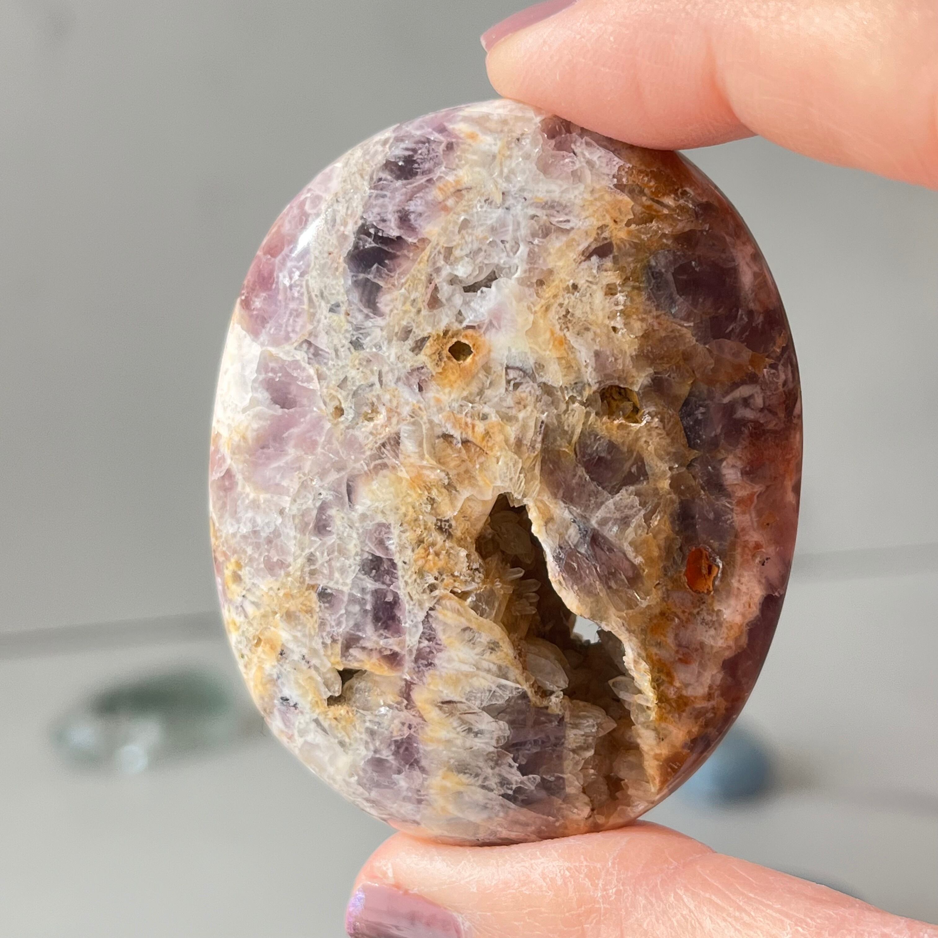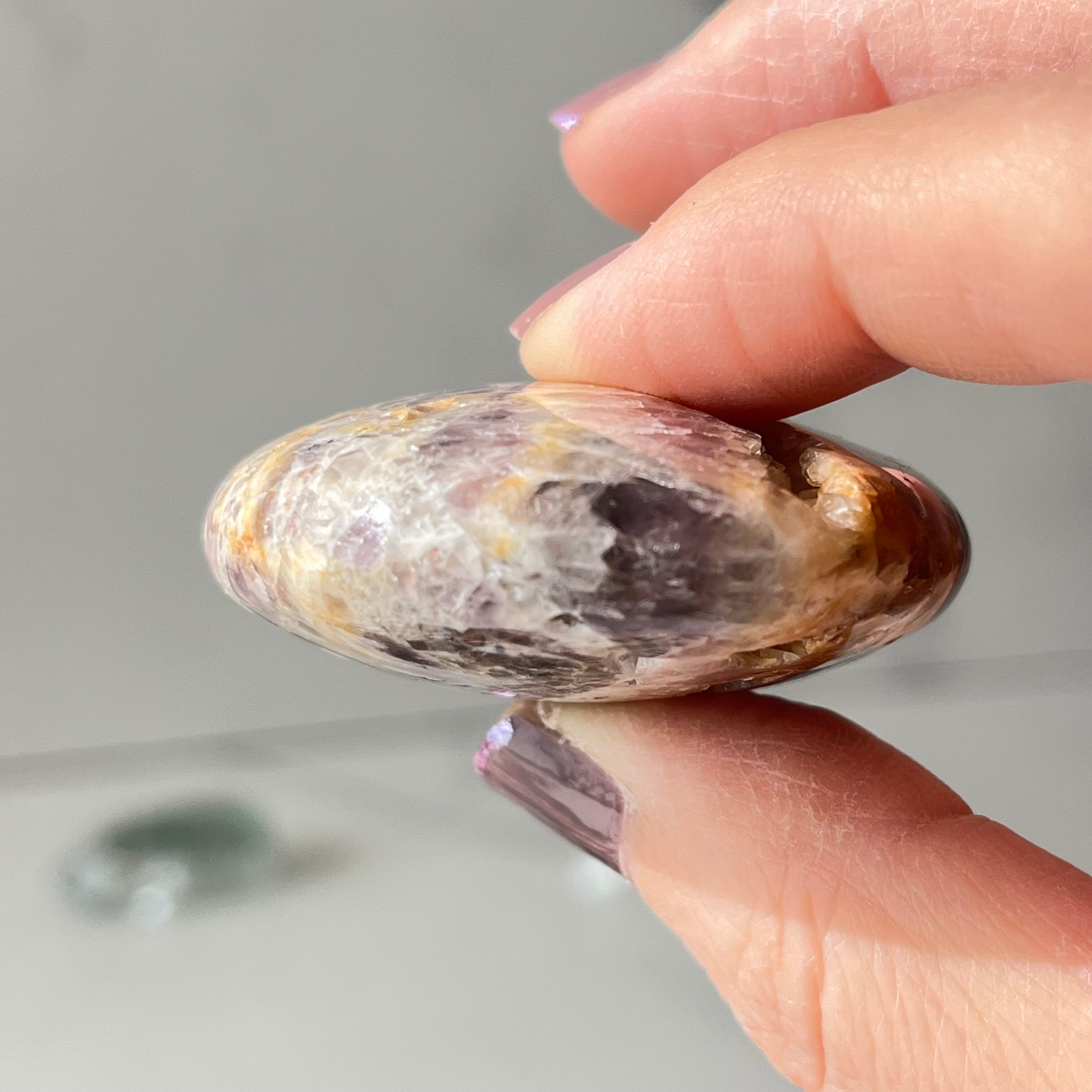 個性的な模様が美しいインドネシア産のアメジストのパームストーンです。