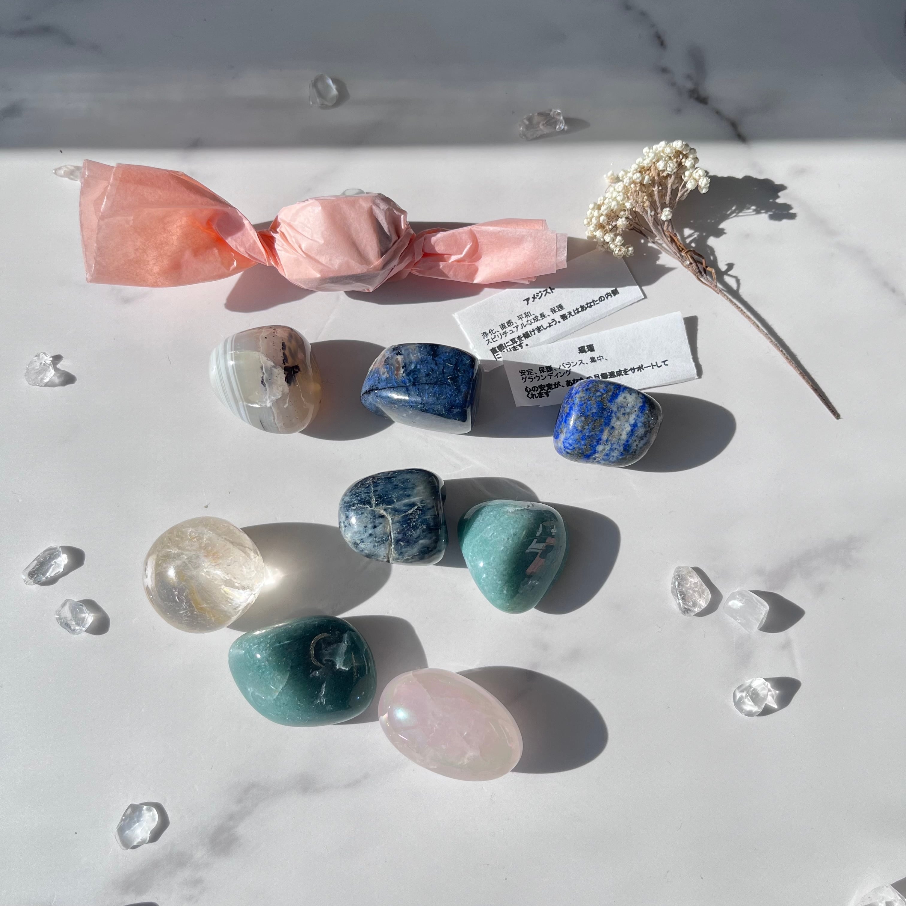 このおみくじは、可愛らしいタンブル(天然石)と一緒に、それぞれの石が持つ意味やメッセージがセットになっています